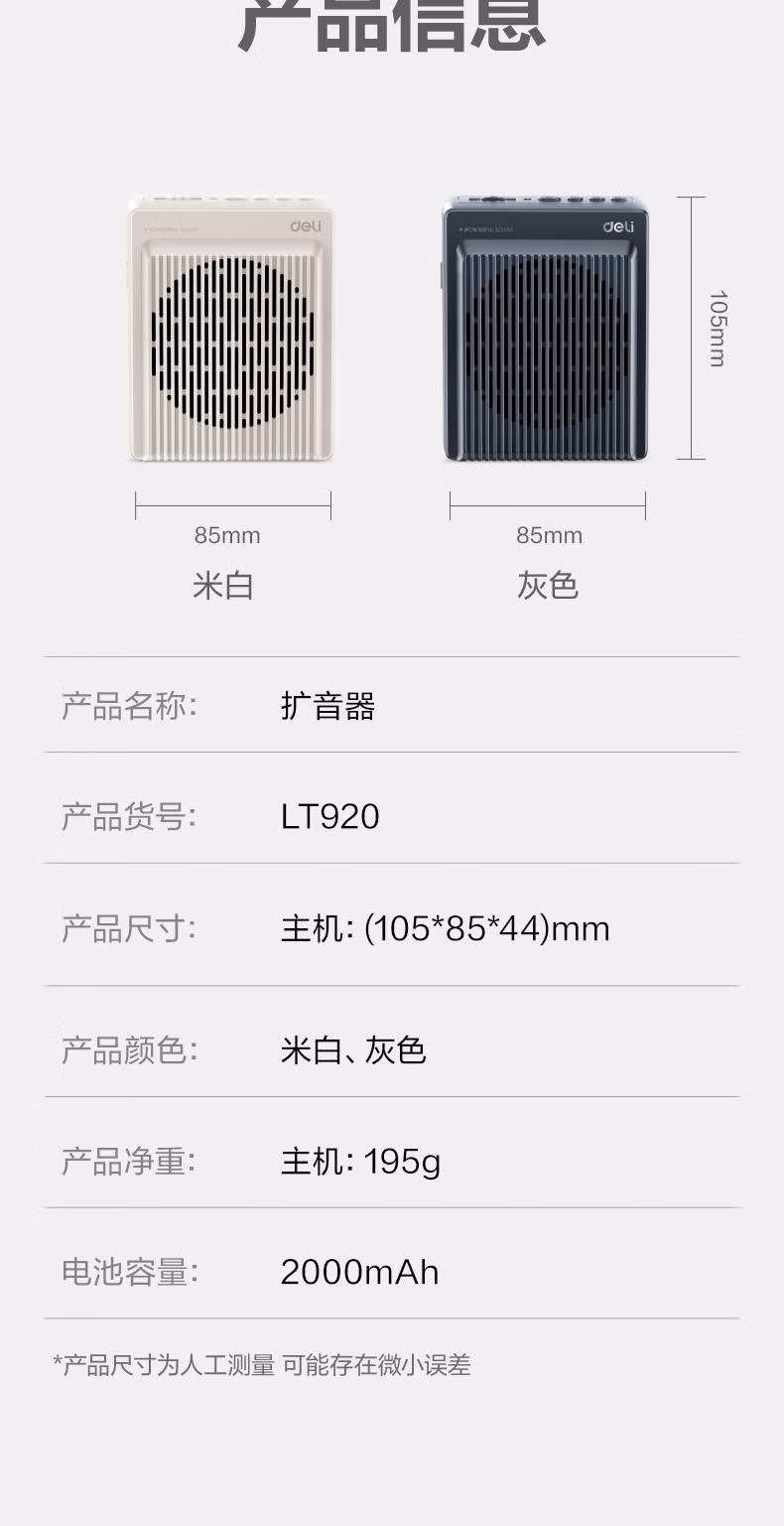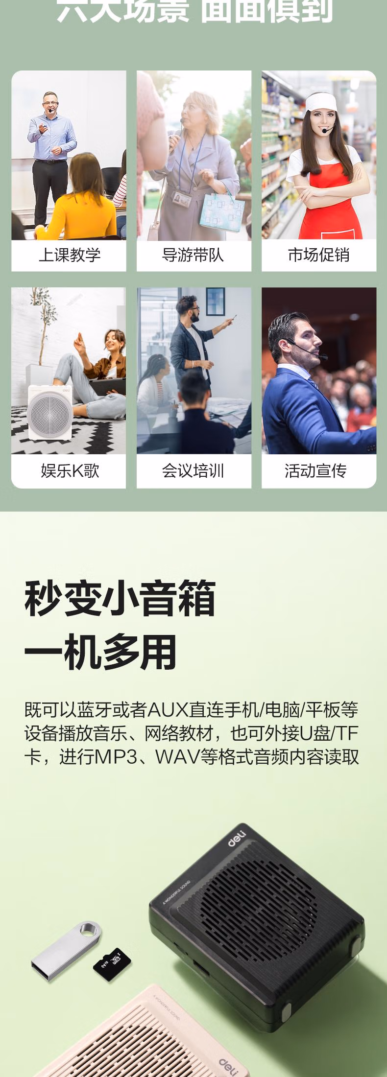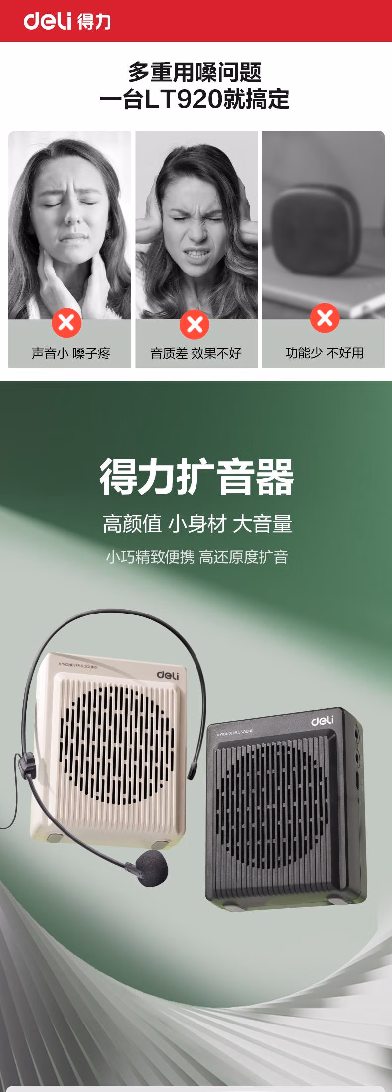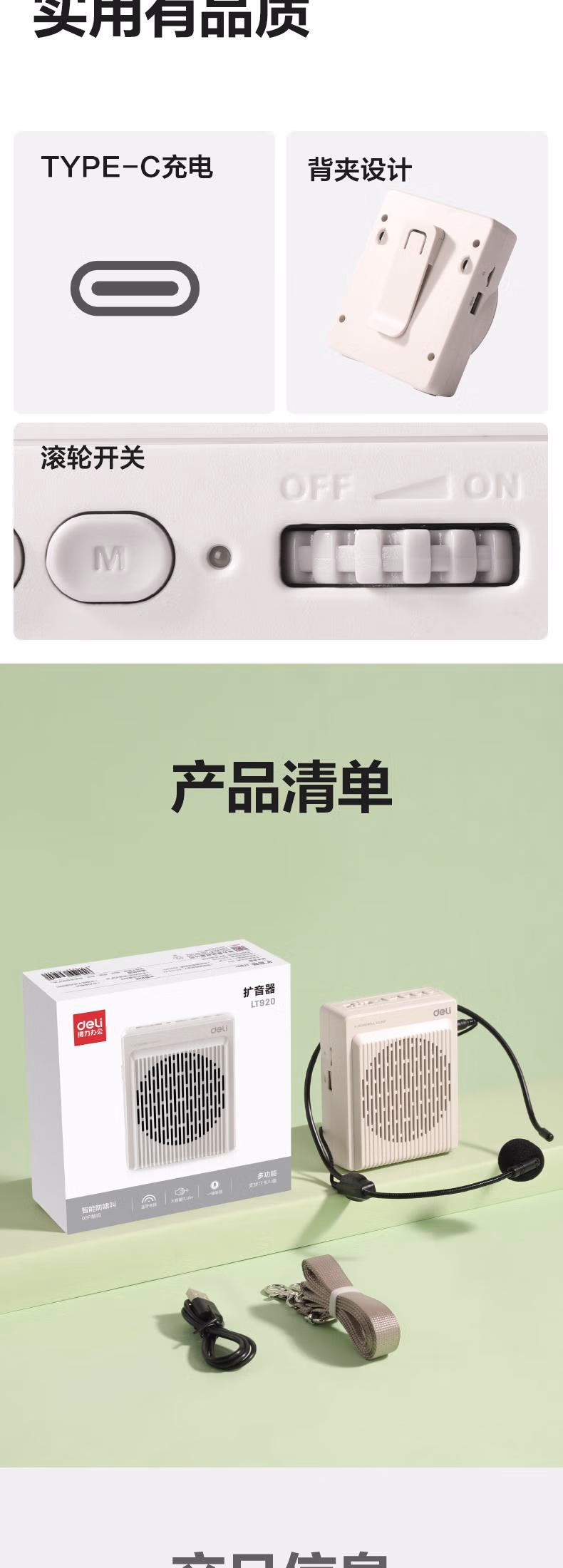 包装清单  :   得力(deli)13W小蜜蜂有线款扩音器教师专用音箱小喇叭腰挂麦克风录音蓝牙插卡导游便携喊话器生日礼物灰