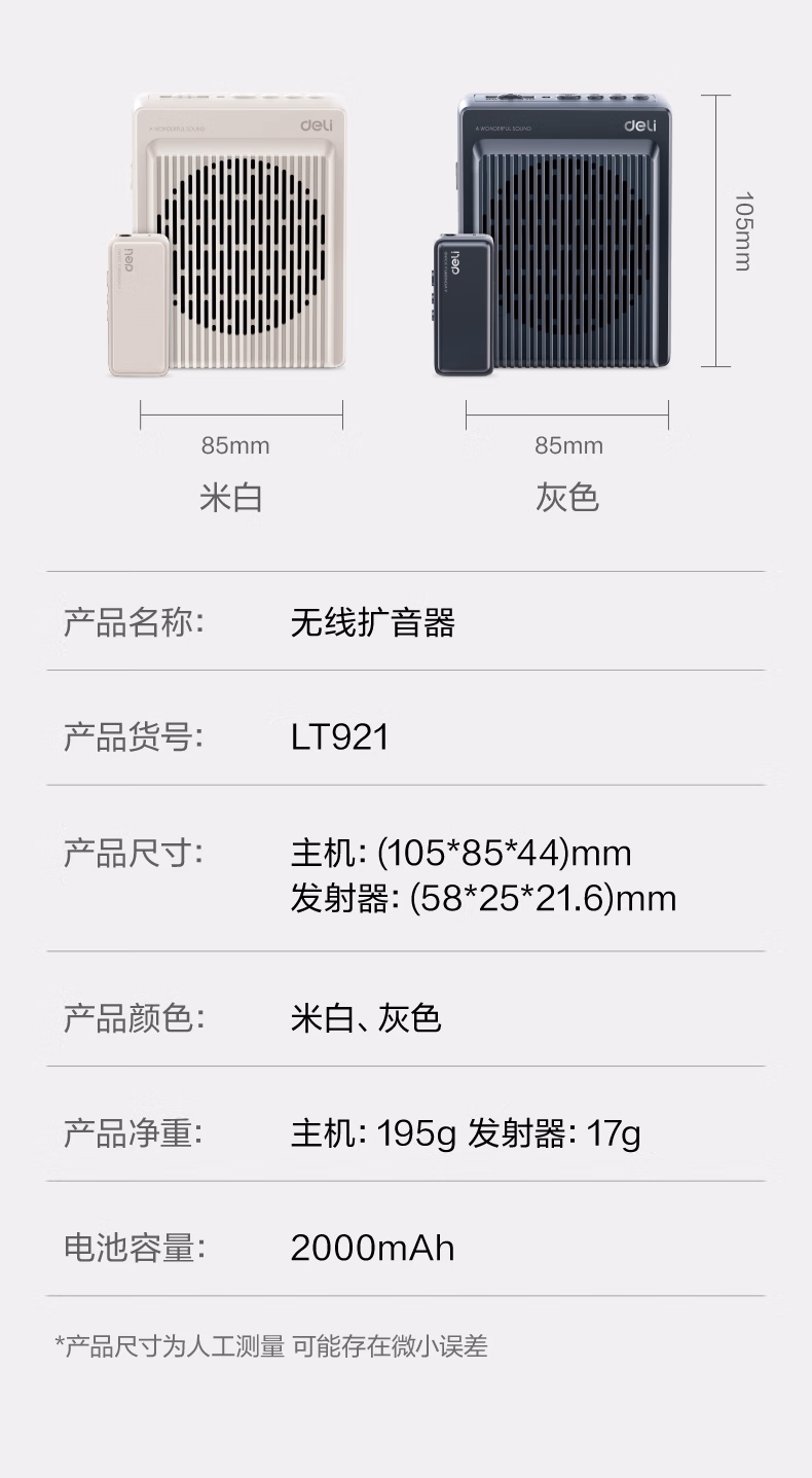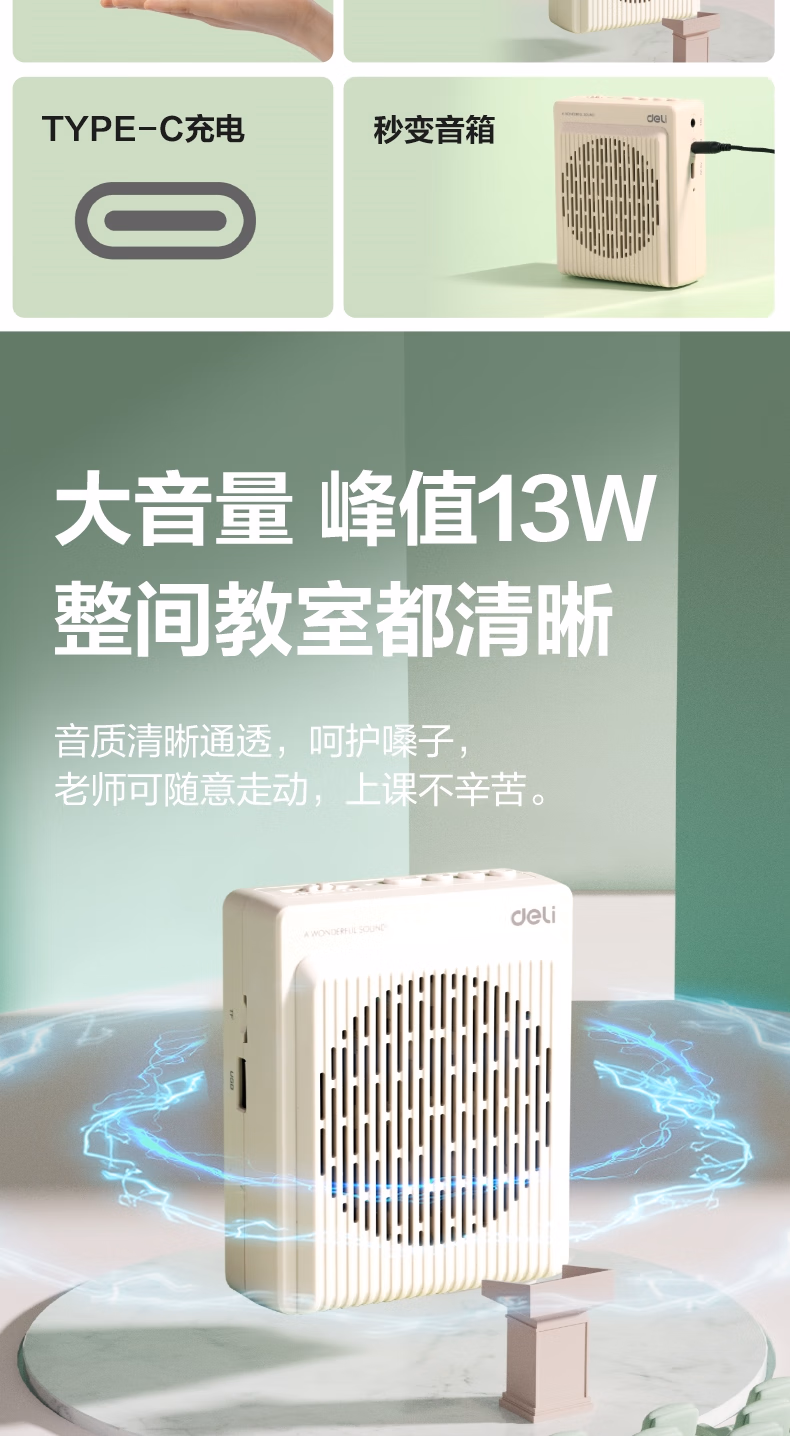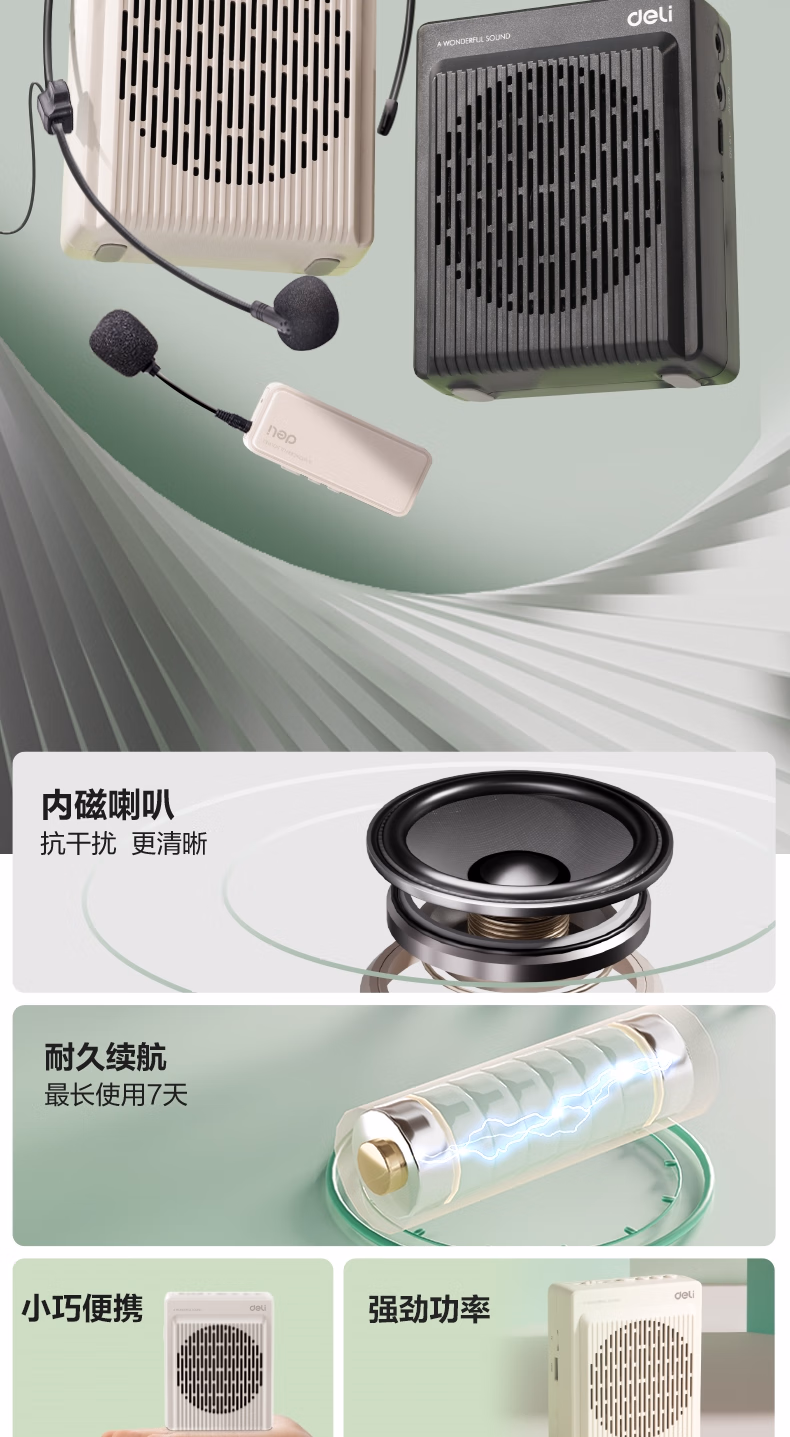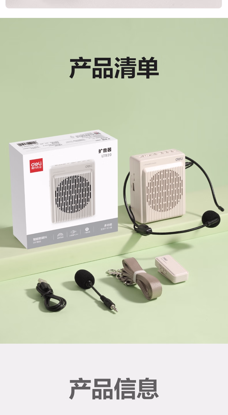 包装清单  :   得力(deli)13W小蜜蜂无线款扩音器教师专用音箱小喇叭腰挂麦克风350秒录音蓝牙插卡喊话器导游便携式灰