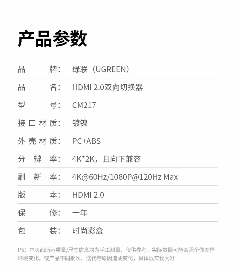 包装清单  :   HDMI2.0双向切换器二进一出 4K60Hz高清视频分配器一分二 笔记本电脑显示器接电视投影分屏器50966