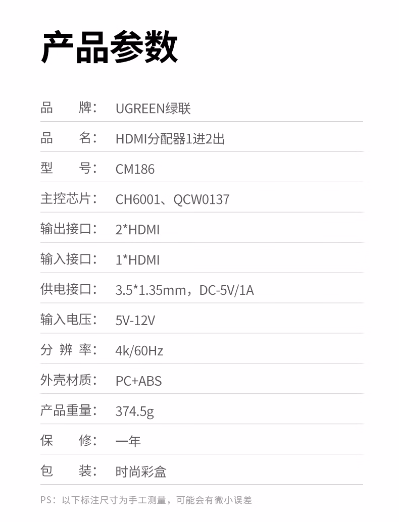 包装清单  :   HDMI分配器2.0一分二4K60Hz1进2出视频分屏笔记本电脑电视盒子接电视显示器投影仪同屏显示50707