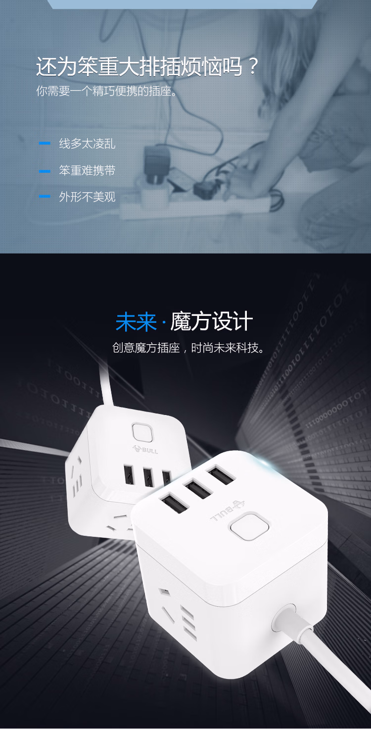 包装清单  :   公牛(BULL)魔方智能USB插座 插线板/插排/排插/接线板/宿舍家用拖线板 GN-U303U 白色魔方总控开关USB插座