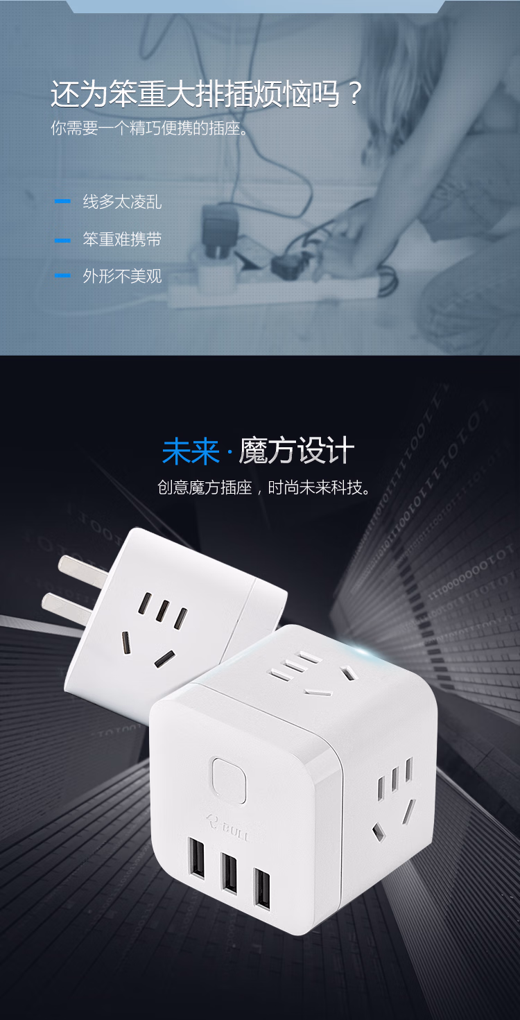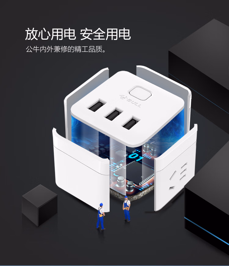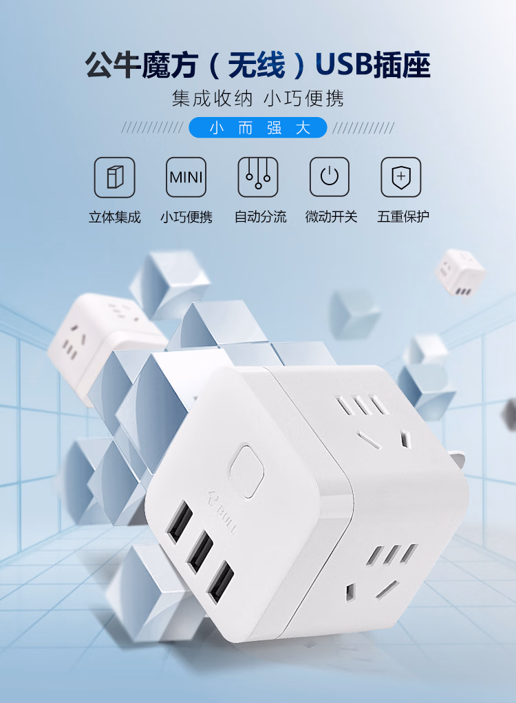 包装清单  :   公牛(BULL)魔方智能USB插座 插线板/插排/排插/接线板/拖线板 GN-U303UW 白色无线总控开关魔方