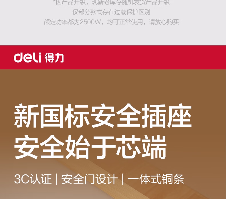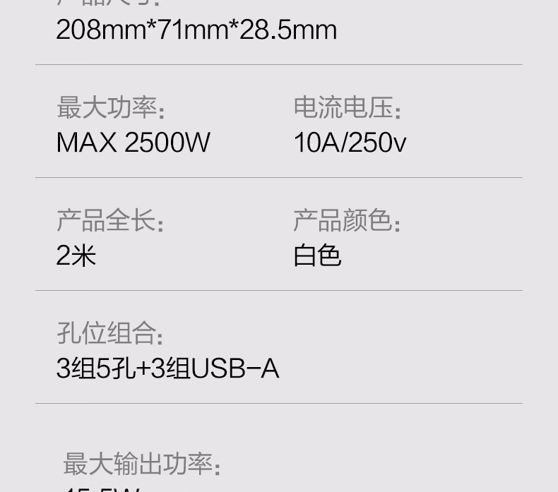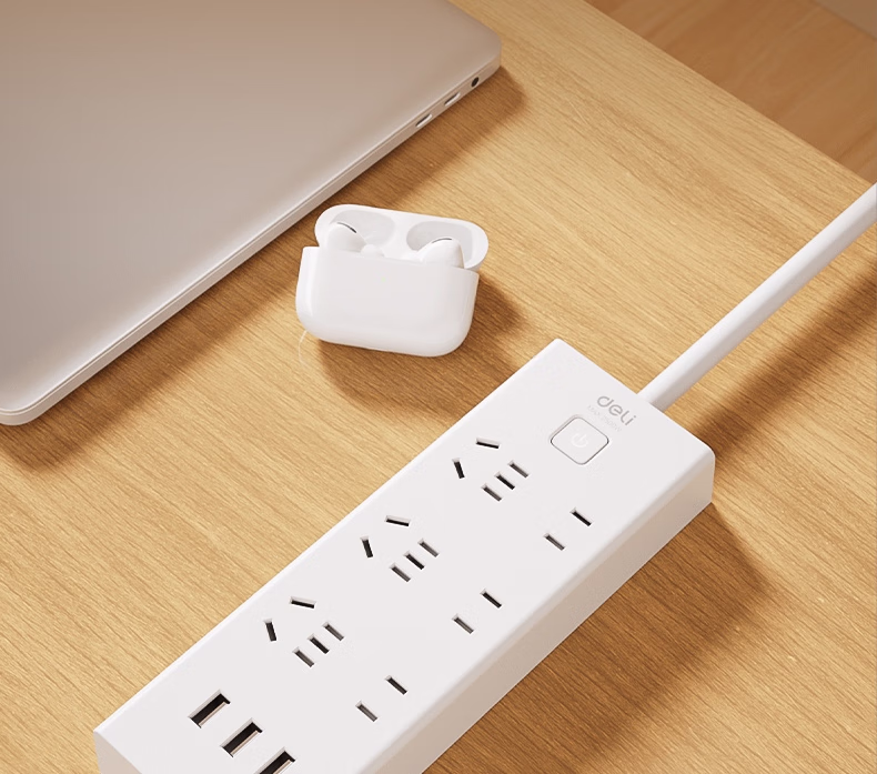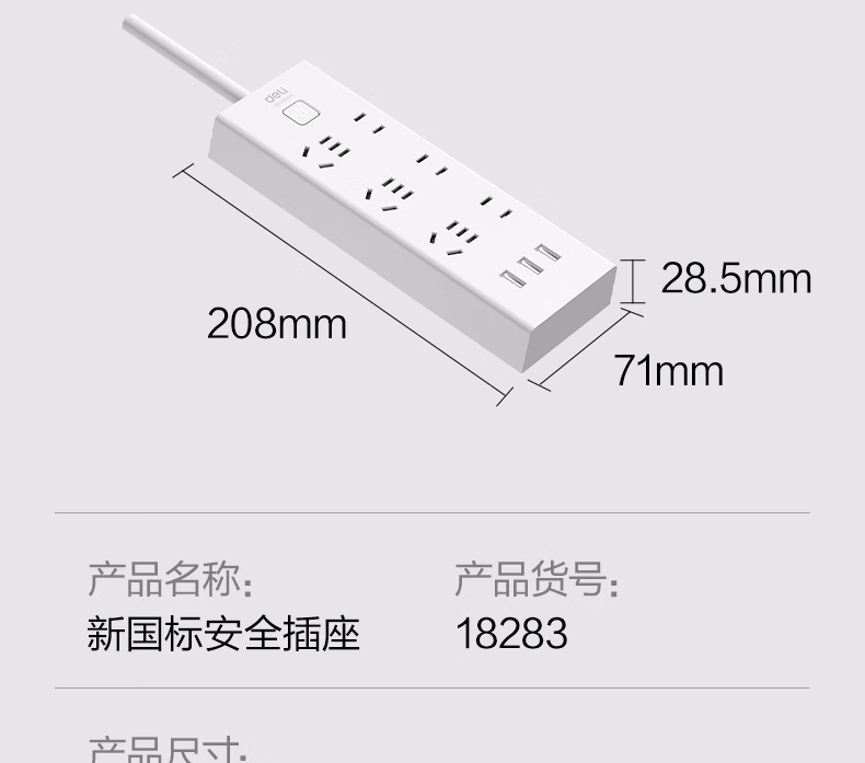 包装清单  :   得力(deli)USB智能插座 插排/插线板/接线板/排插/拖线板 3USB接口+6孔 总控2米 儿童保护门 18283