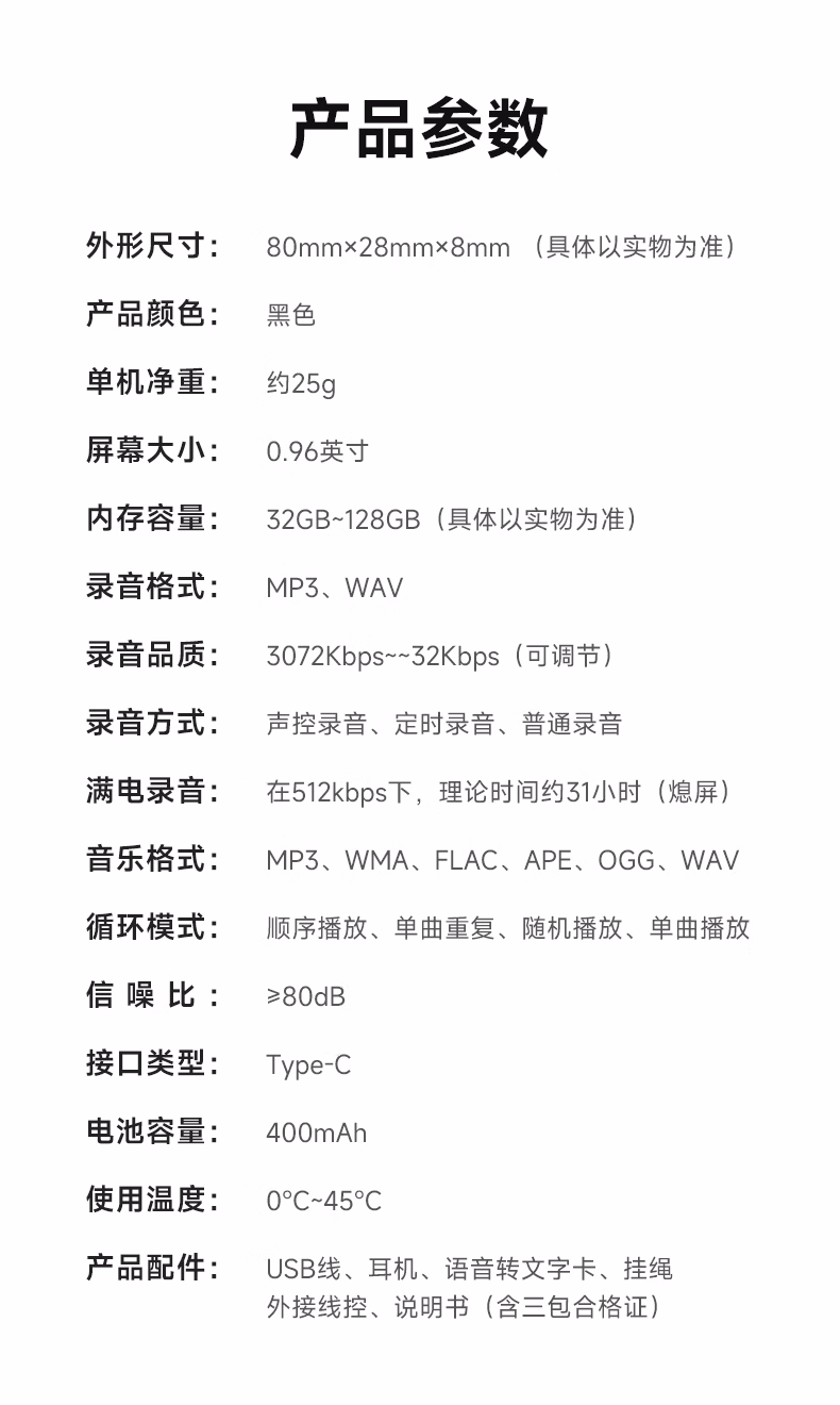 包装清单  :   纽曼录音笔 W7 32G专业高清降噪录音一键录音智能声控超薄轻便便携录音神器