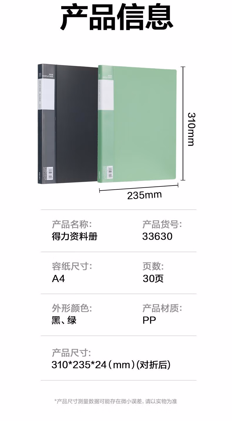 包装清单  :   得力(deli)A4/30页资料册文件收纳册插页袋学生试卷收纳袋奖状收集册 办公用品文件保护 绿色