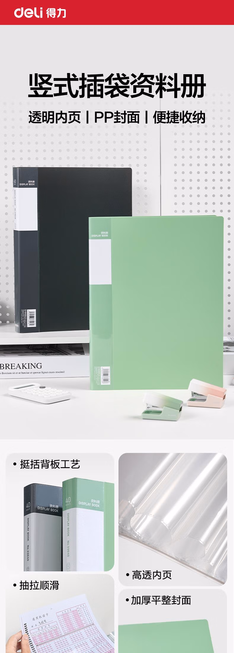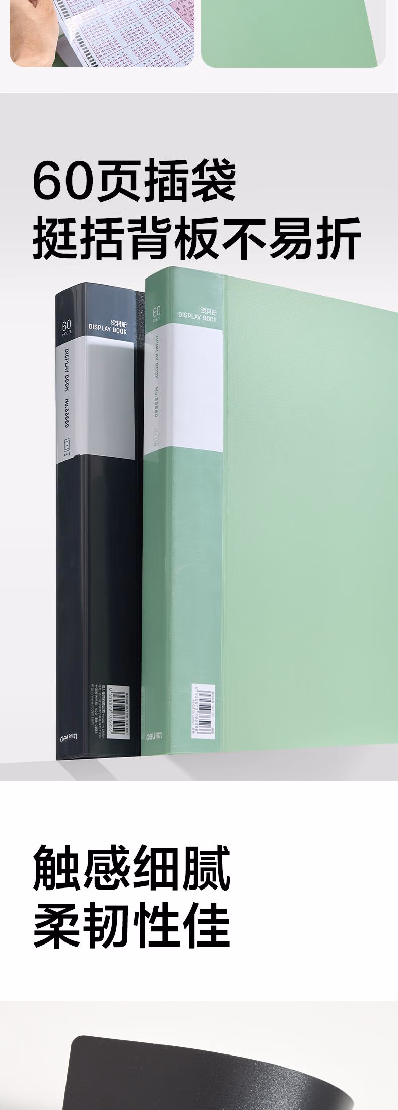 包装清单  :   得力(deli)A4/60页资料册活页收纳册 文件夹插页袋学生试卷收纳袋奖状收集册孕检报告 办公文件保护 绿色