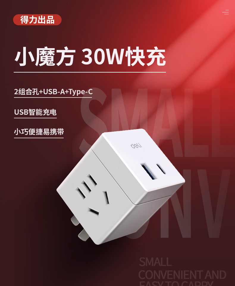 包装清单  :   得力(deli)30W快充 魔方插座 旅行转换插头 插排/插线板/接线板/排插 2孔+Type-C口+USB口 无线魔方 33938