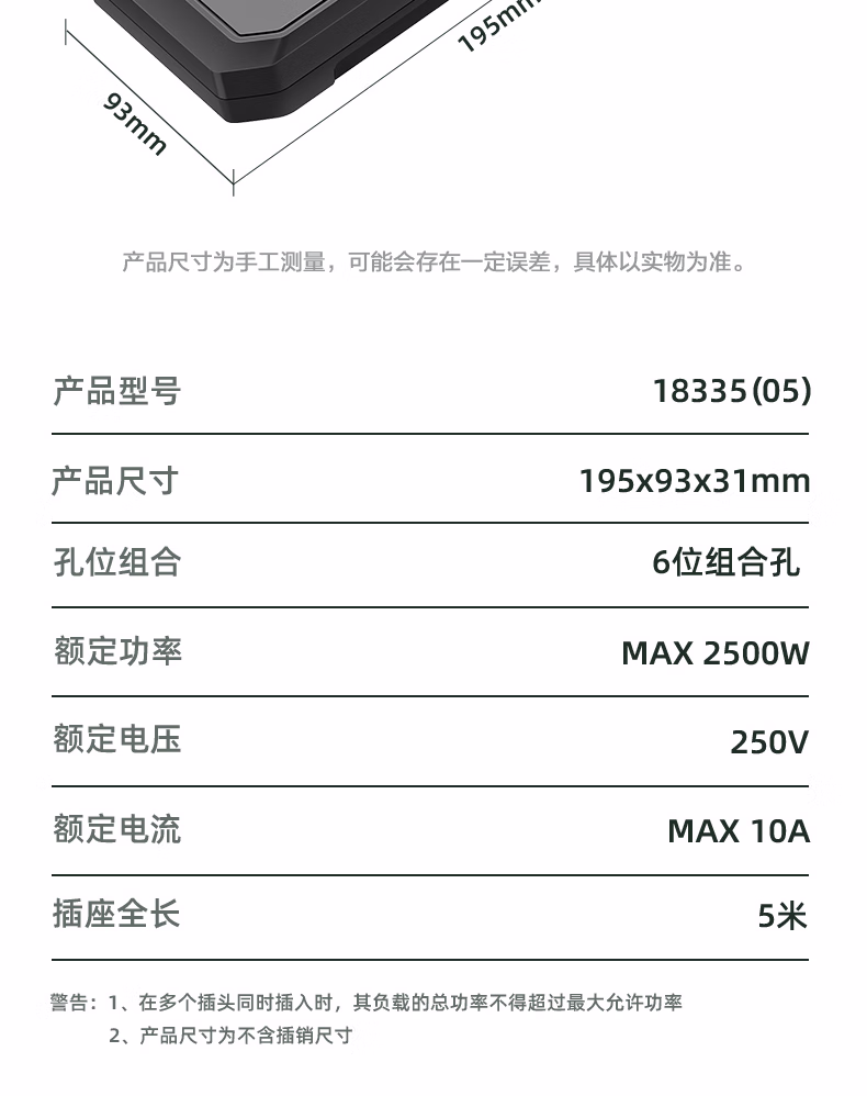 包装清单  :   得力(deli)3C认证国标安全插座 插排/插线板/接线板/排插/拖线板 6位5米 总控开关 黑色 18335(05)