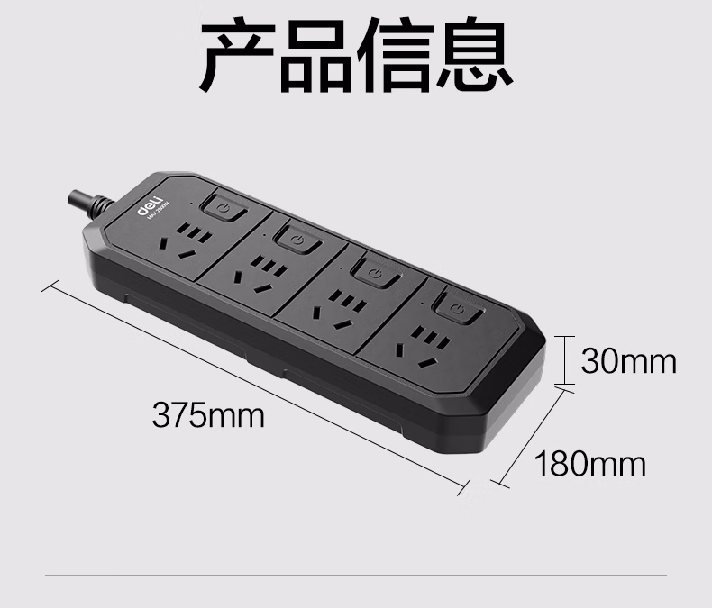 包装清单  :   得力(deli)3C认证国标安全插座/插排/插线板/排插/接线板 4位独立开关 分控 全长2米 黑色 18340(02)