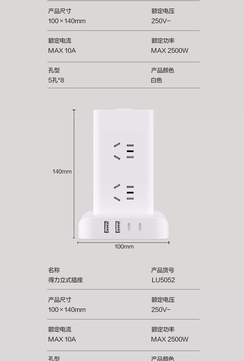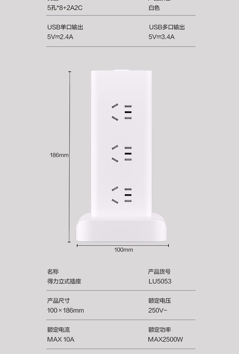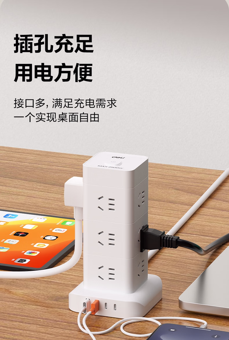 包装清单  :   得力(deli)立式插座 插排/排插/插线板/接线板/拖线板 总控12位+2USB+2TYPE-C全长1.8米 过载保护 LU5054