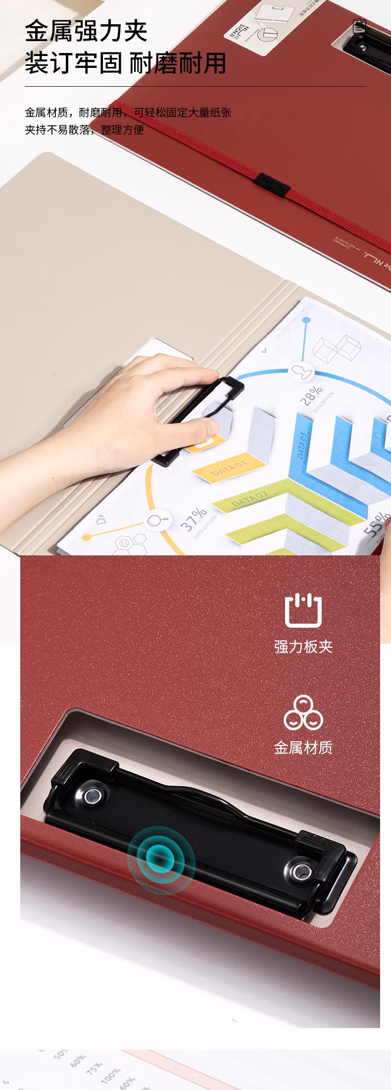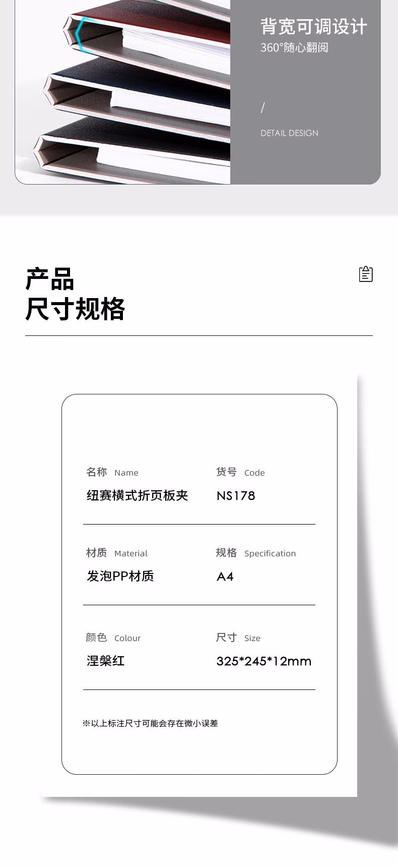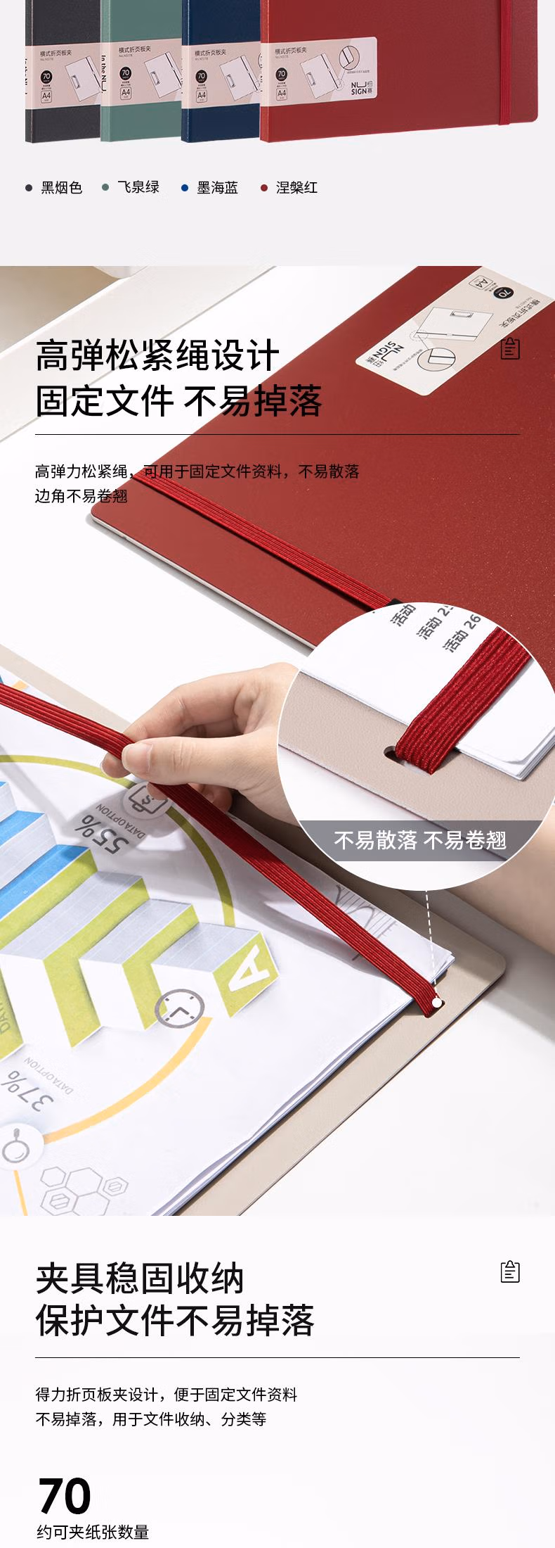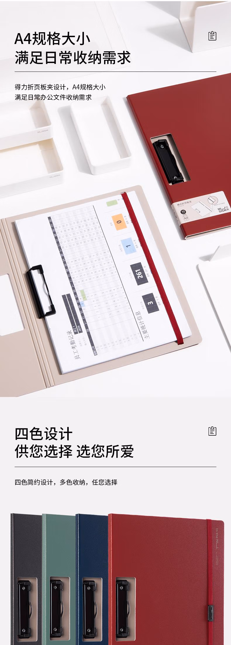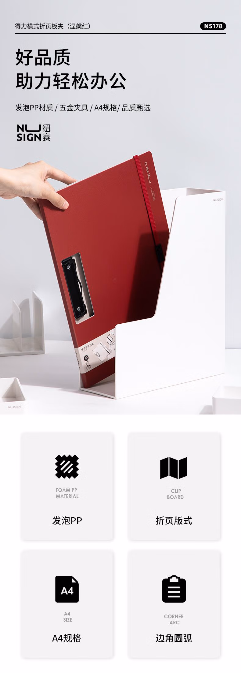 包装清单  :   得力(deli)纽赛(NUSIGN)A4横式折页板夹会议夹 加厚文件夹彩色资料夹资料收纳合同签约办公用品 涅槃红NS178