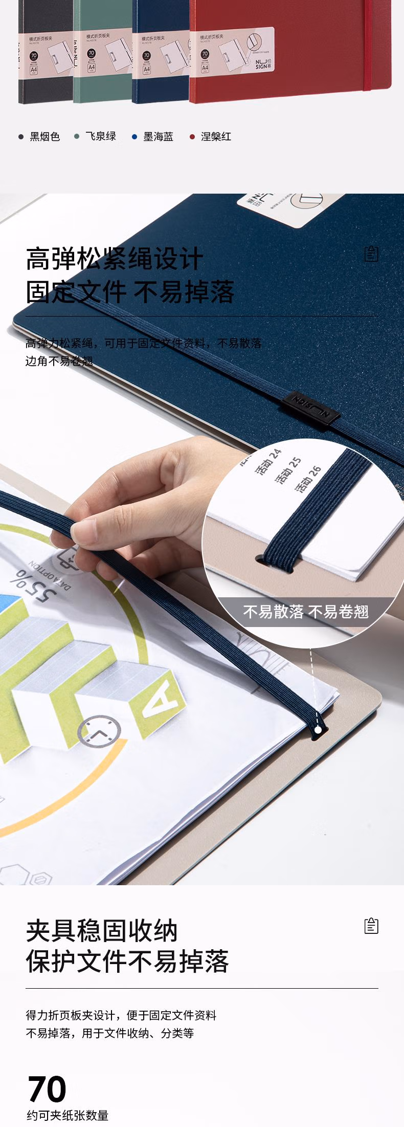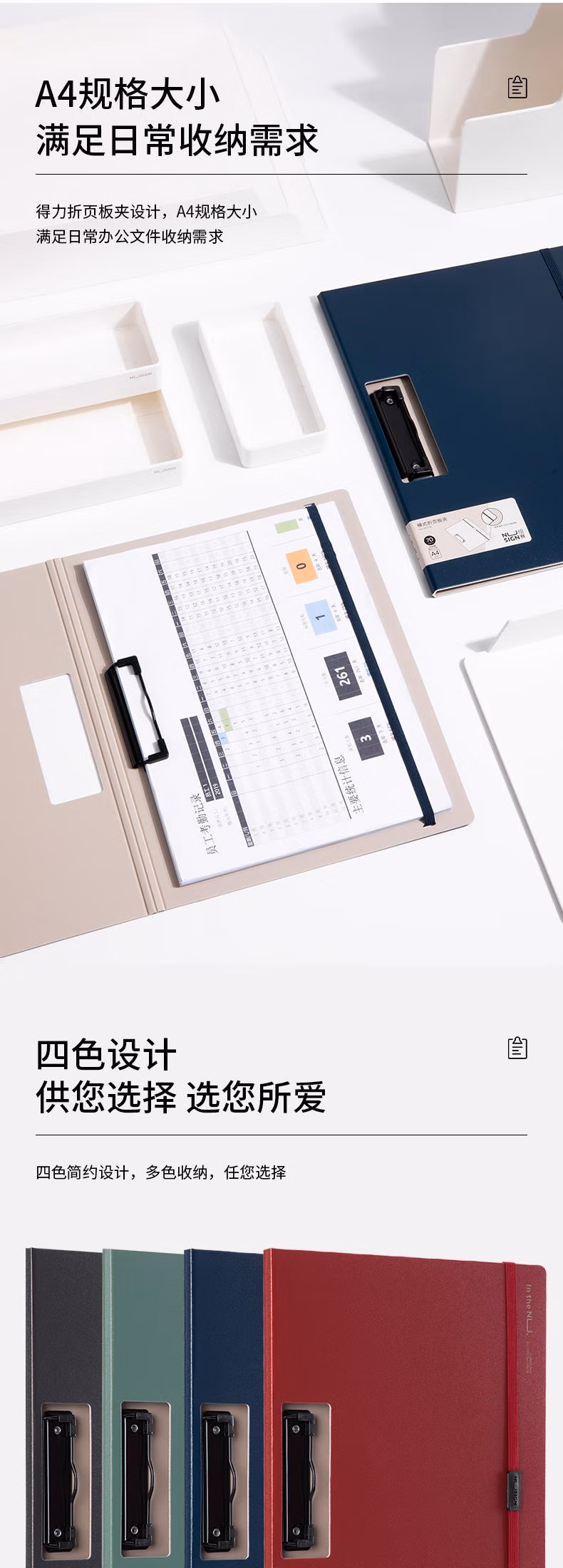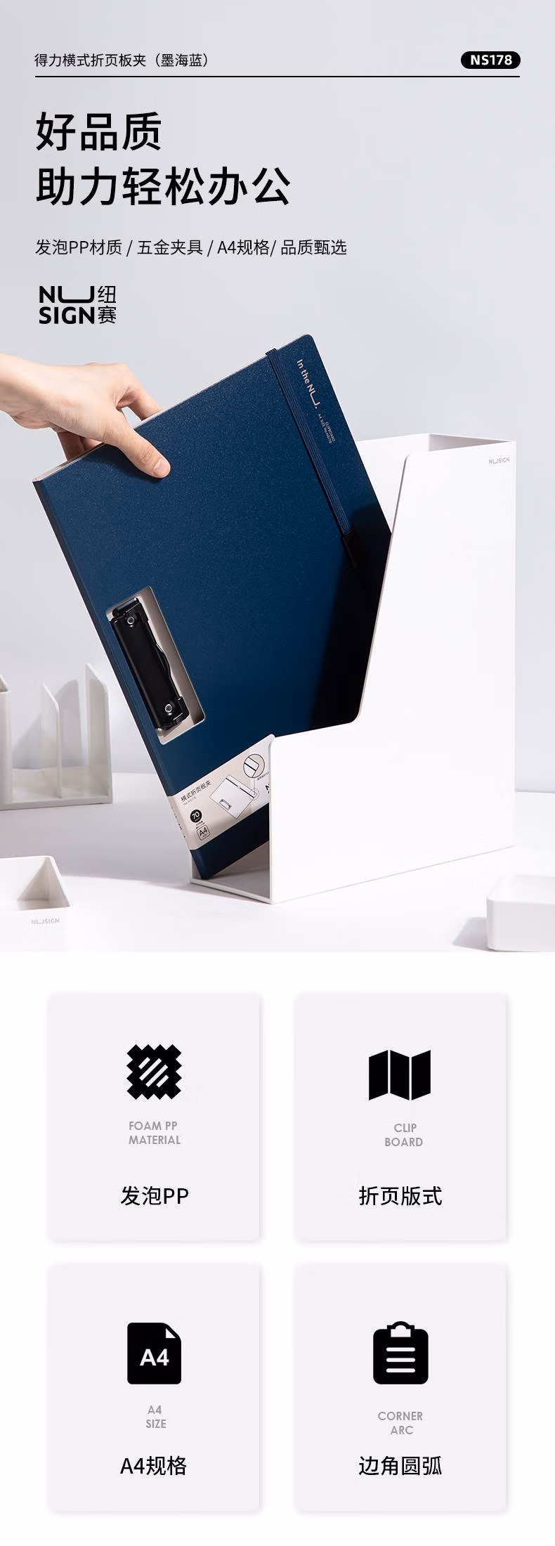 包装清单  :   得力(deli)纽赛(NUSIGN)A4横式折页板夹会议夹 加厚文件夹彩色资料夹文件收纳合同签约办公用品 海军蓝NS178