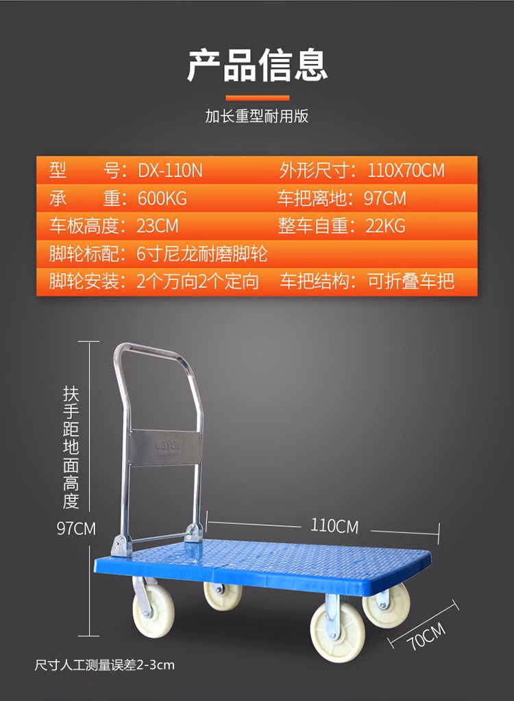 包装清单  :   搬运宝(BYB)加长平板车小推车拉货车手拉车拖车110x70cm承重1200斤 DX-110N