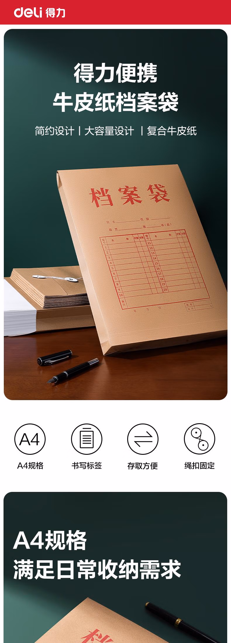 包装清单  :   得力(deli)10个装A4/4cm侧宽/150g牛皮纸档案袋 大容量文件袋资料袋标书合同文件整理收纳袋PP412黄(10个/包)