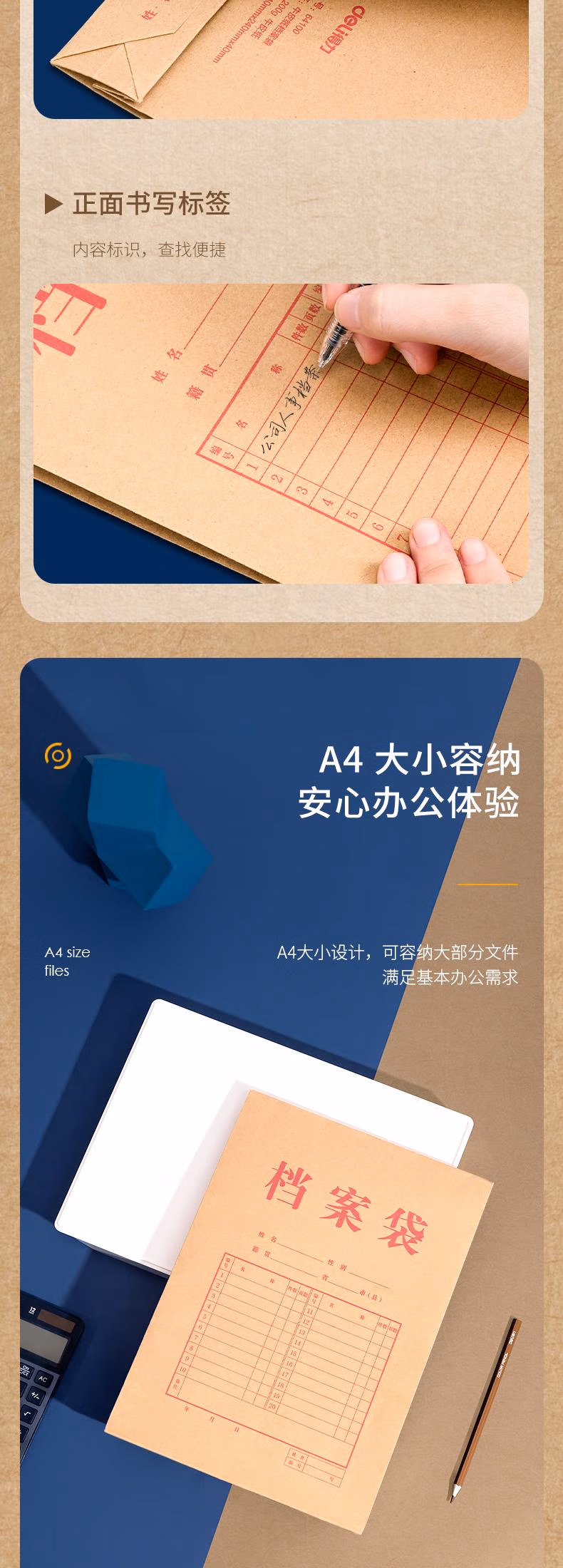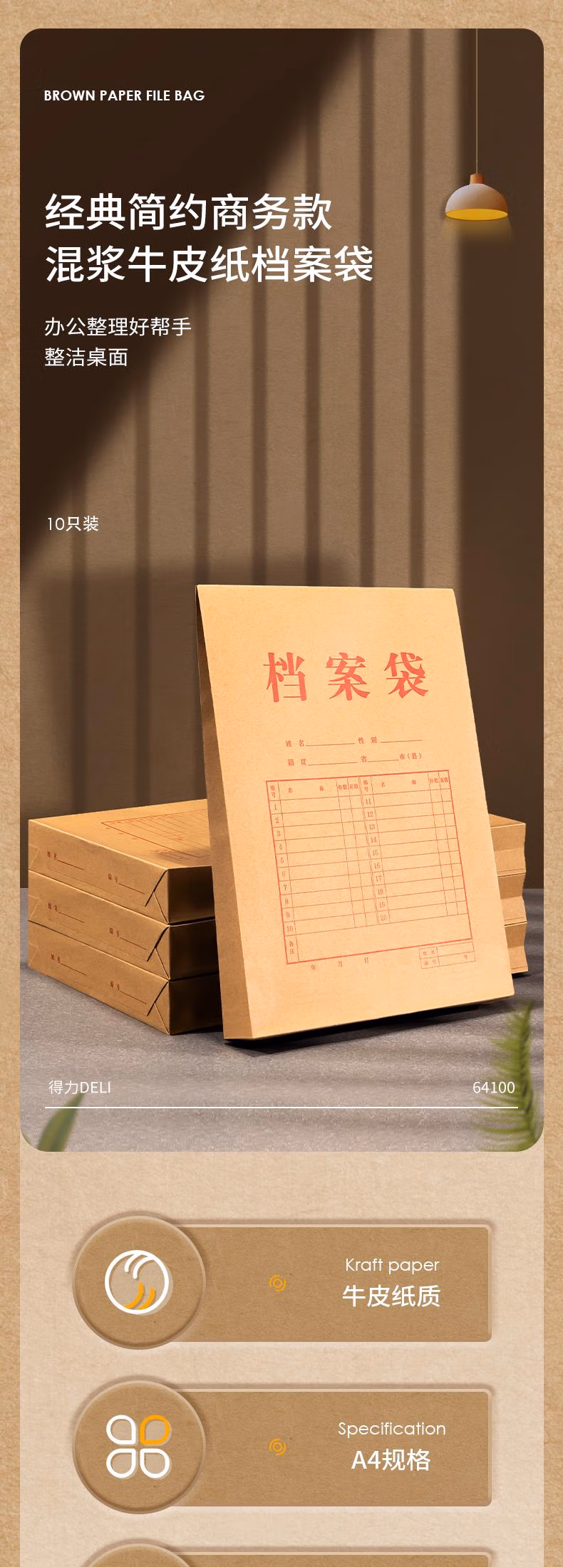 包装清单  :   得力20只A4混浆200g加厚牛皮纸档案袋侧宽4cm标书合同文件资料袋票据资料收纳袋办公文件保护64100