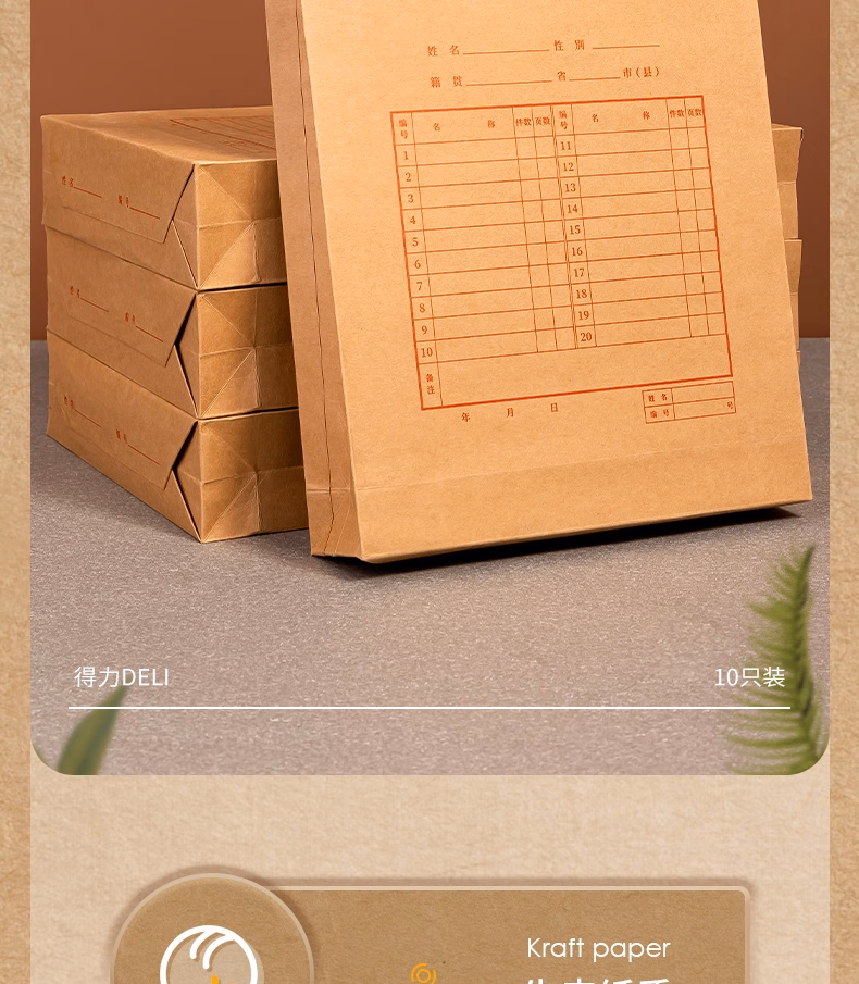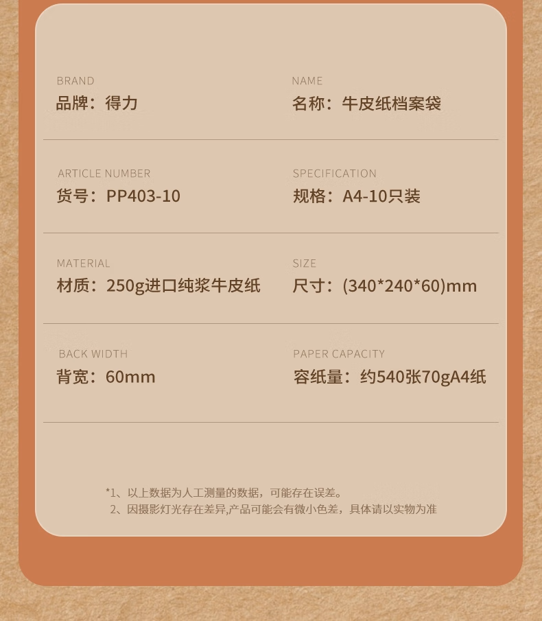 包装清单  :   得力(deli)10只A4侧宽6cm纯浆250g牛皮纸档案袋票据收纳 标书合同文件资料袋 办公PP403-10