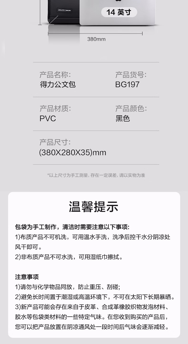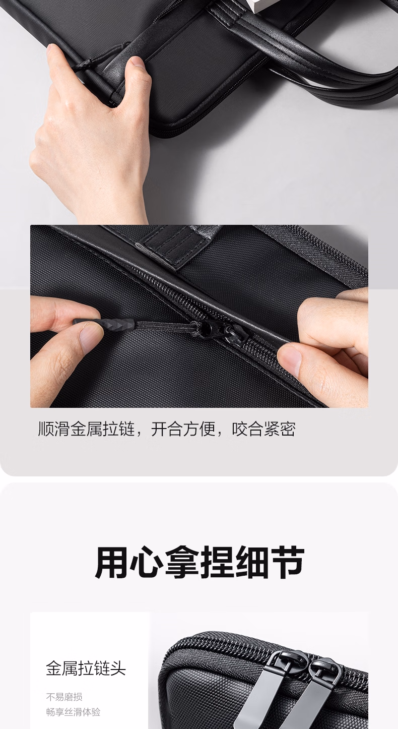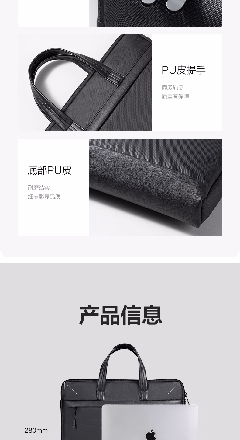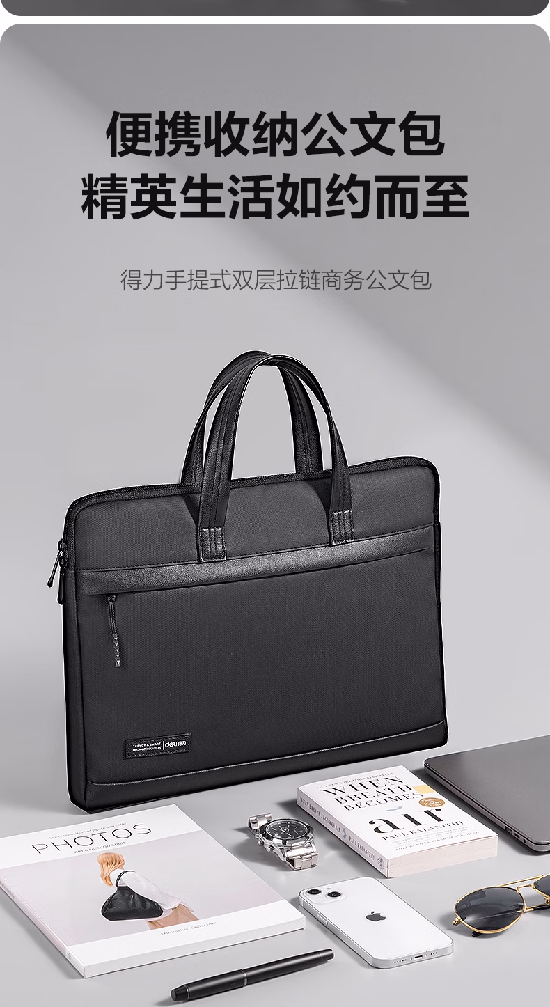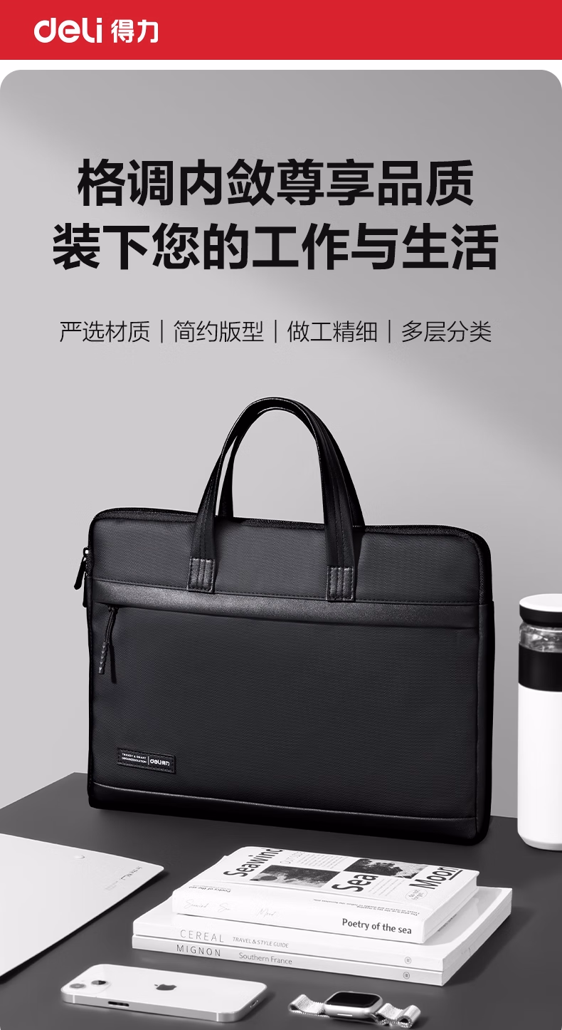 包装清单  :   得力(deli)质感皮膜拼接商务公文包 拉链前袋便携手提事务包 多隔层大容量办公文件收纳袋 黑