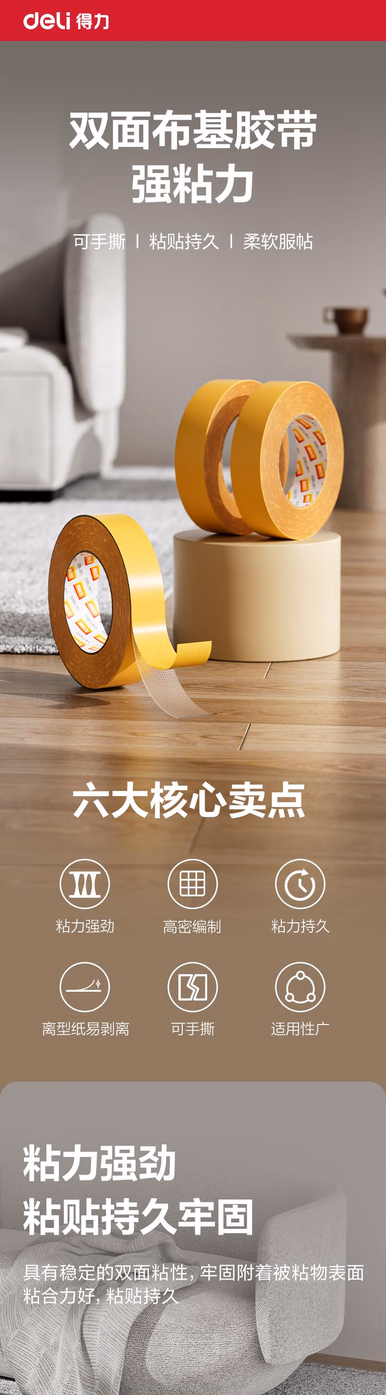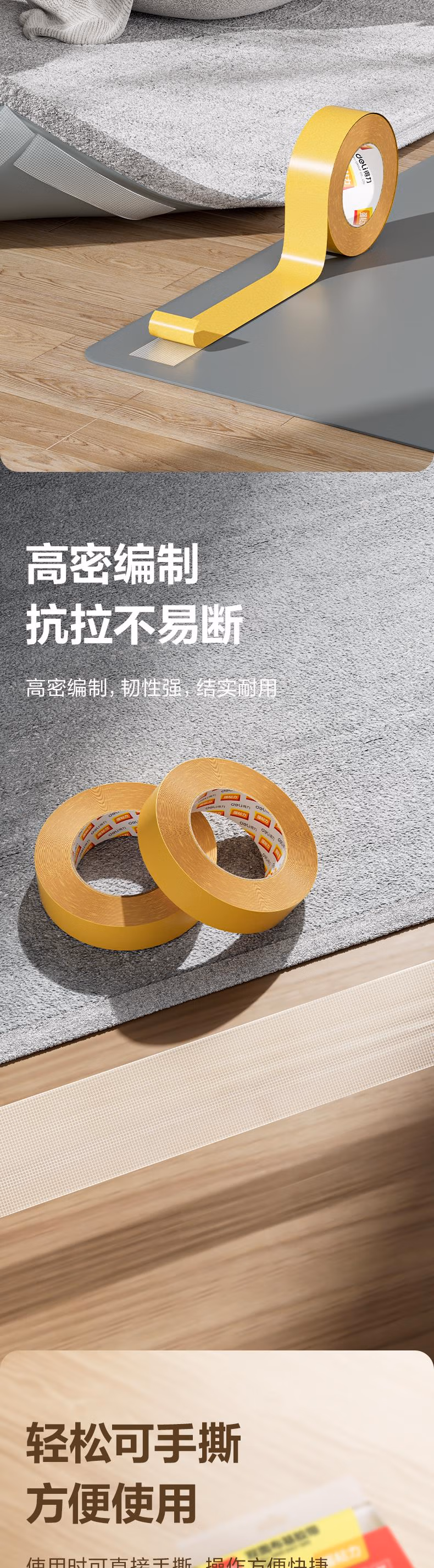 包装清单  :   得力(deli)防台风强力双面布基胶带防风加厚网格双面胶 30mm*20m*280μm 地毯无痕固定 1卷 30803