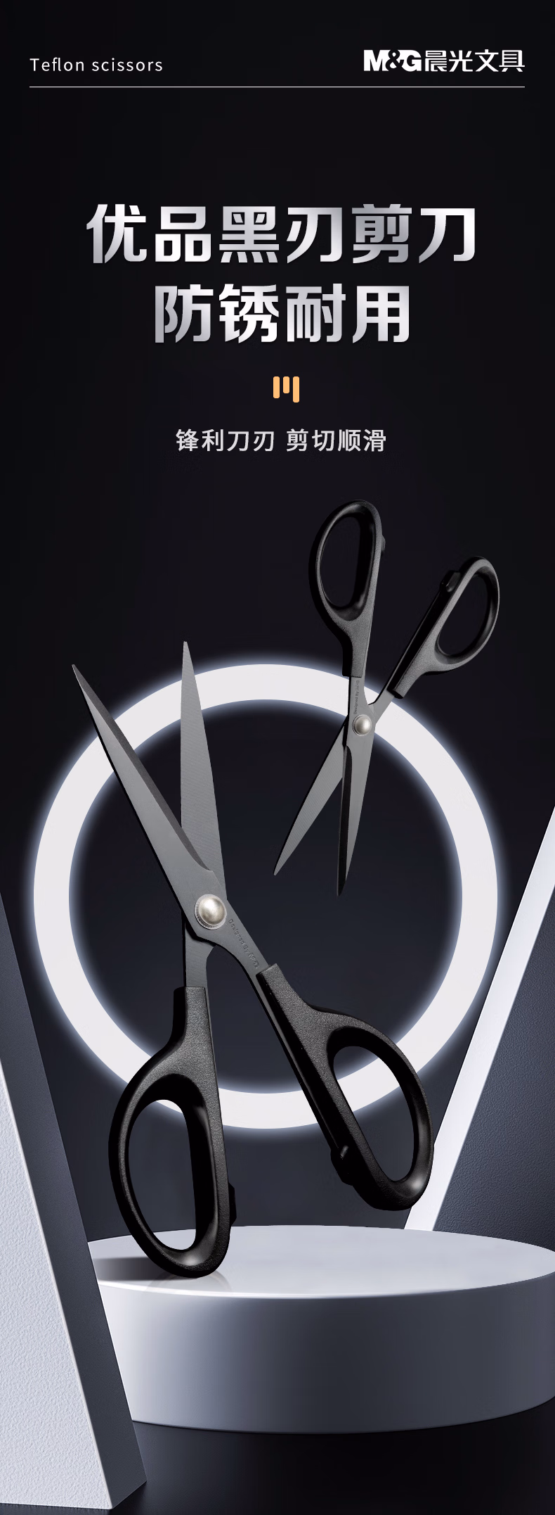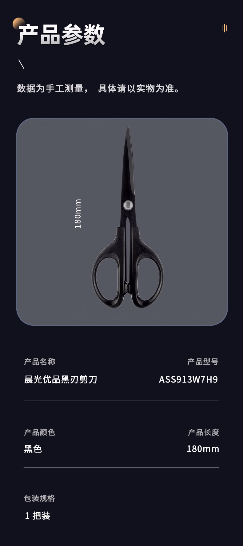 包装清单  :   晨光(M&G)文具热门商品 180mm优品耐磨黑刃剪刀 不易粘胶 家用手工生活耐用剪刀 办公用品 ASS913W7H9