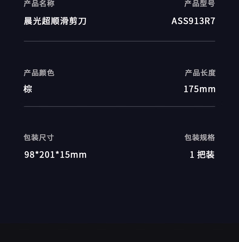 包装清单  :   晨光(M&G)175mm特氟龙省力剪刀 软胶手柄 圆角刀刃 防锈防粘 办公用品 家用好物 棕色单把ASS913R7H