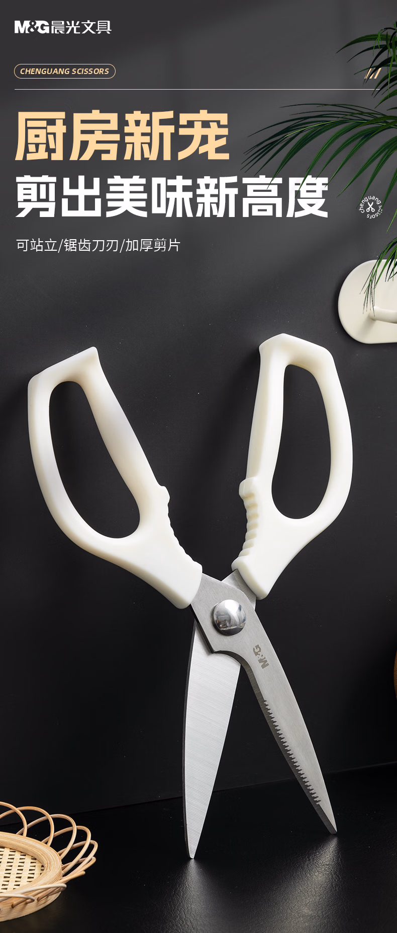 包装清单  :   晨光(M&G)文具热门商品 全能剪厨房剪刀 可站立厨房剪 鸡骨裁缝辅食烤肉食物专用不锈钢剪刀 ASS913AD