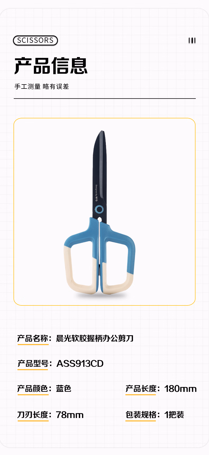 包装清单  :   晨光(M&G)文具 180mm黑刃剪刀 软胶不锈钢刀刃不易粘胶 家用手工生活耐用剪刀 办公用品 蓝色 ASS913CDB