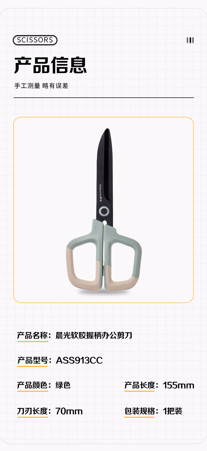 包装清单  :   晨光(M&G)文具 155mm黑刃剪刀 软胶不锈钢刀刃不易粘胶 家用手工生活耐用剪刀 办公用品 绿色 ASS913CC