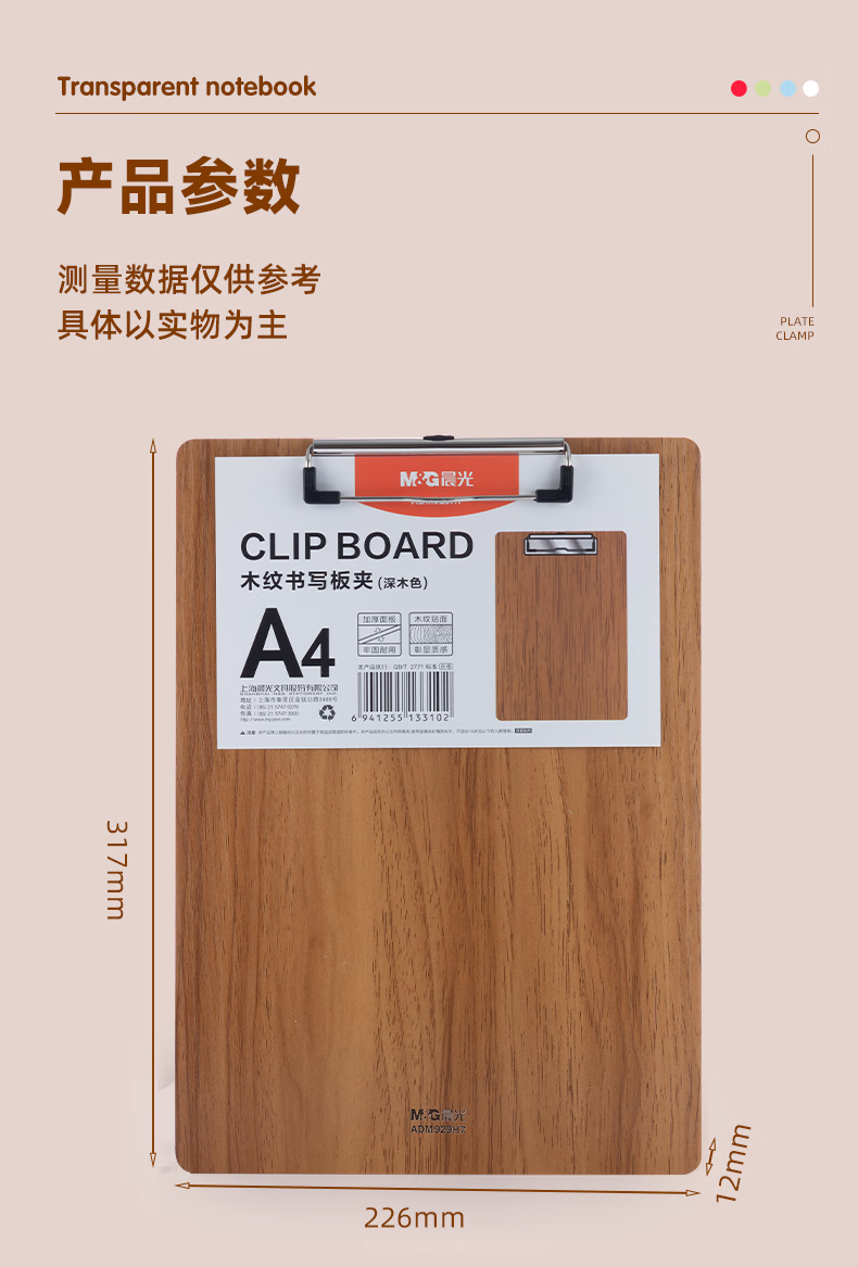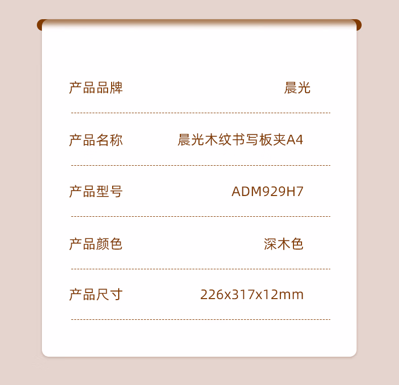 包装清单  :   晨光(M&G)文具A4深色木纹书写板夹 加厚记事夹文件夹垫板 单个装ADM929H7