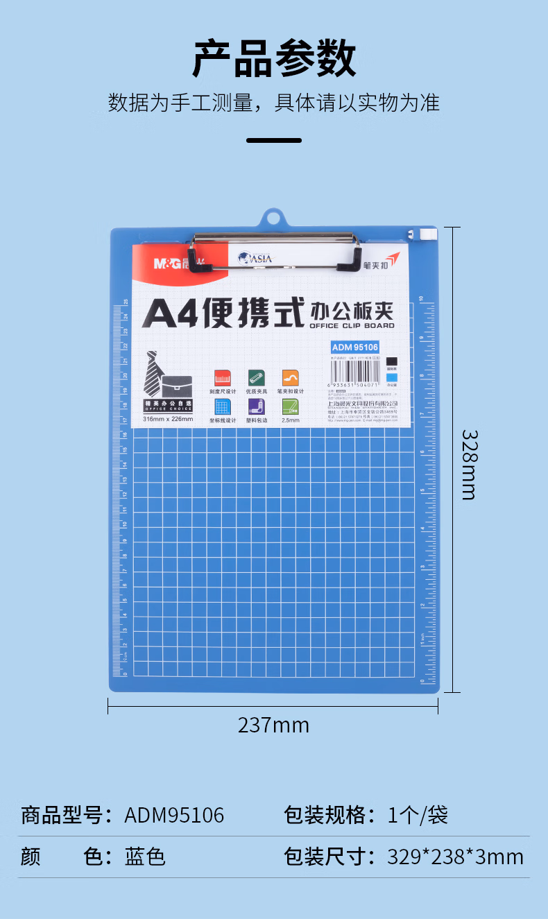 包装清单  :   晨光(M&G)文具A4蓝色便携竖式书写板夹 记事夹文件夹垫板 单个装ADM95106
