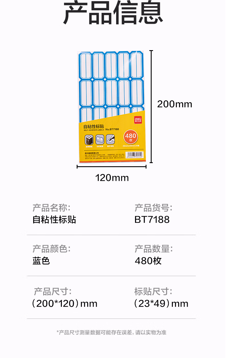 包装清单  :   得力(deli)480枚量贩装自粘性标贴23*49mm蓝色分栏BT7188