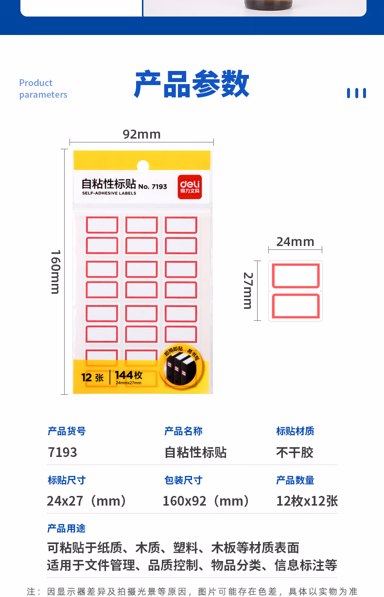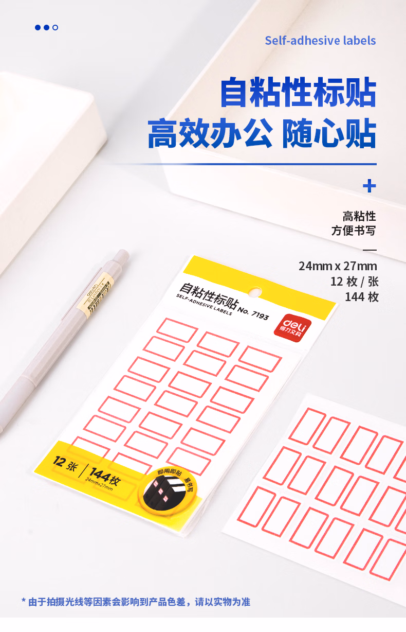 包装清单  :   得力(deli)144枚24*27mm红框不干胶标签贴纸便利贴自粘性标贴姓名贴 7193开学礼物