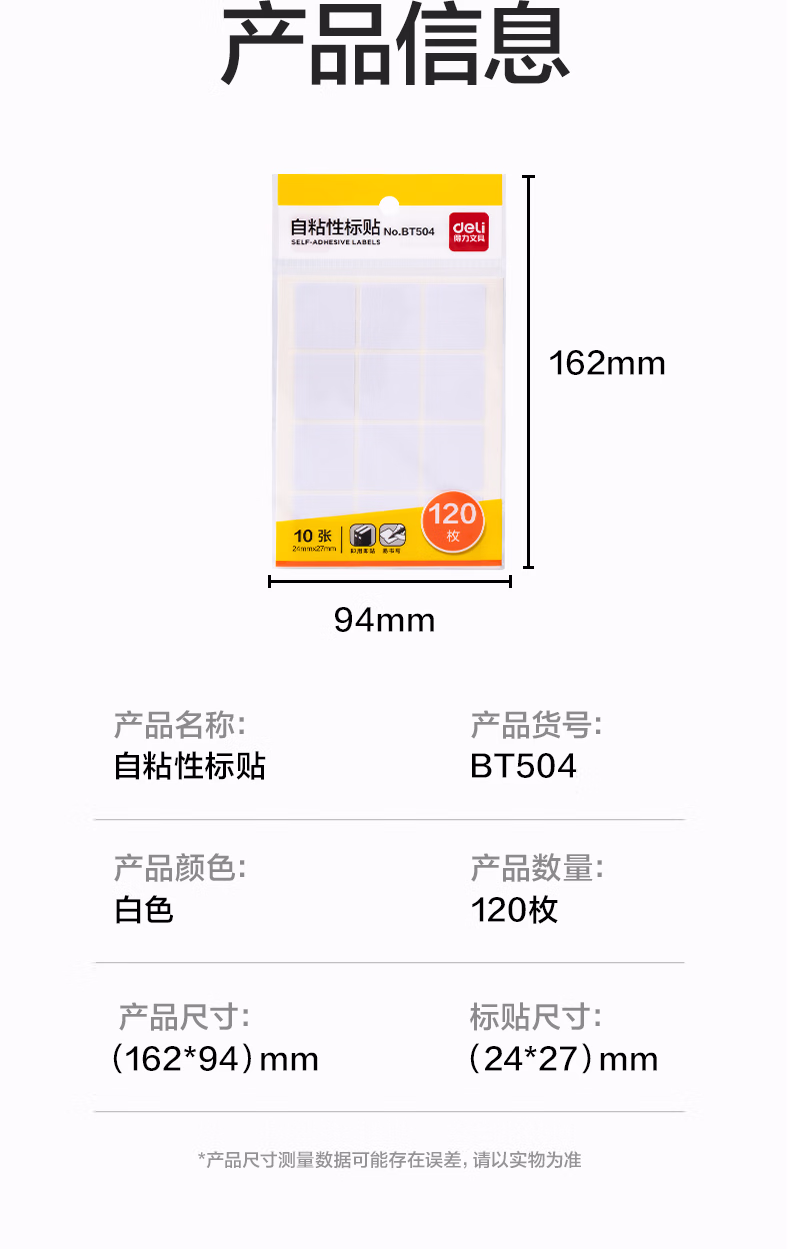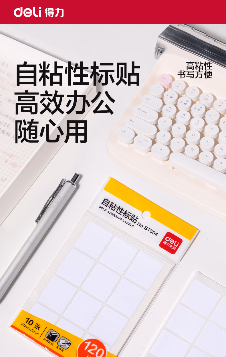 包装清单  :   得力(deli)120枚自粘性标贴24*27mm10张/包BT504白色空白索引