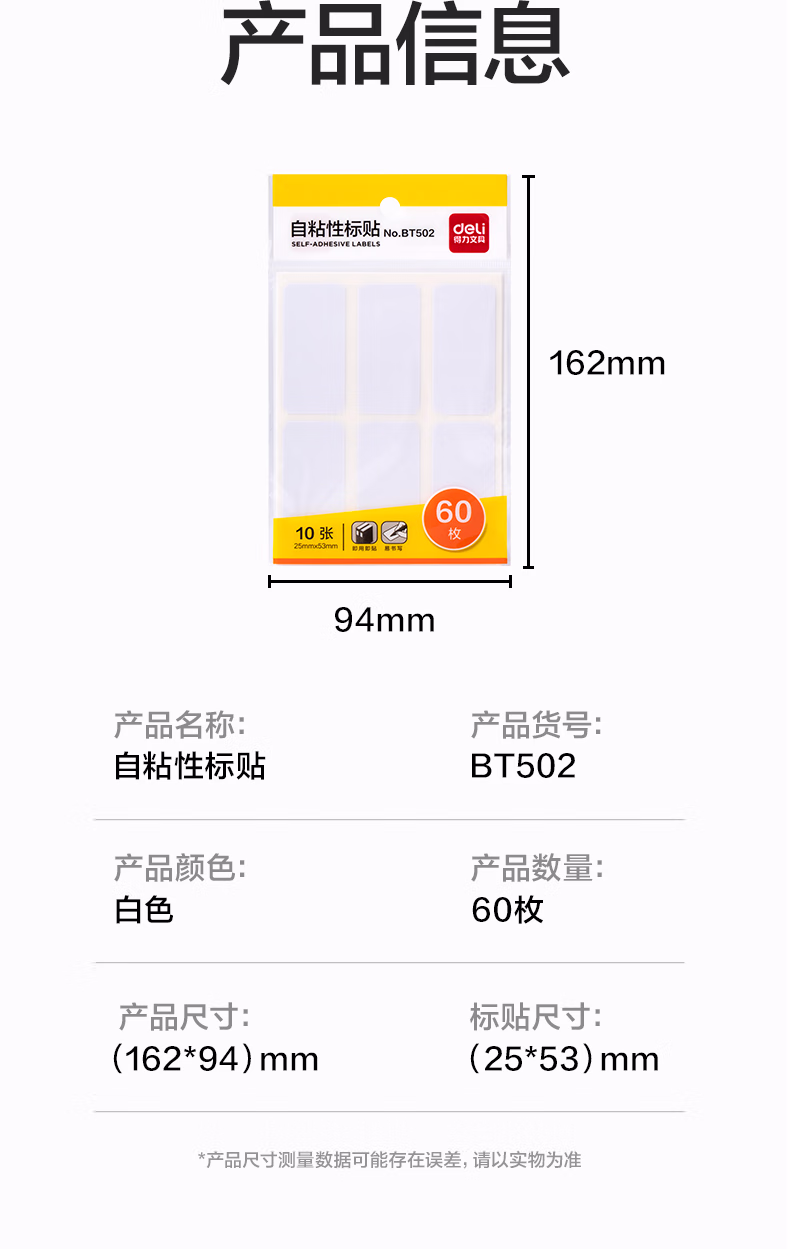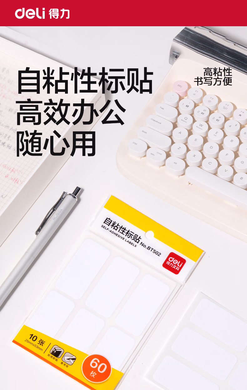 包装清单  :   得力(deli)自粘性标贴25*53mm10张/包BT502白色