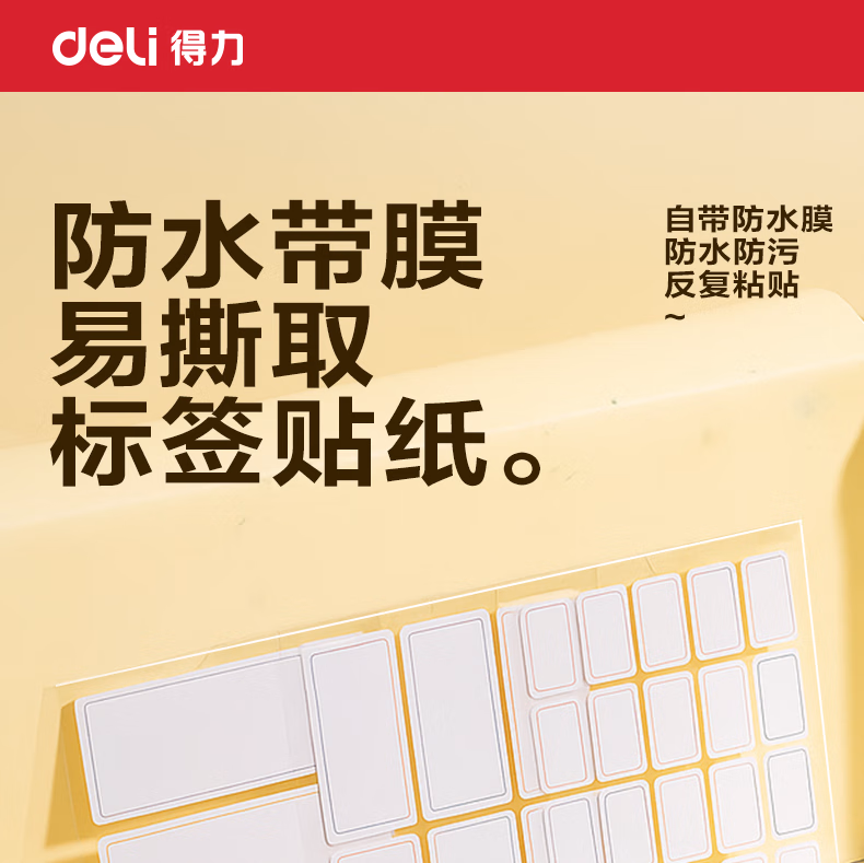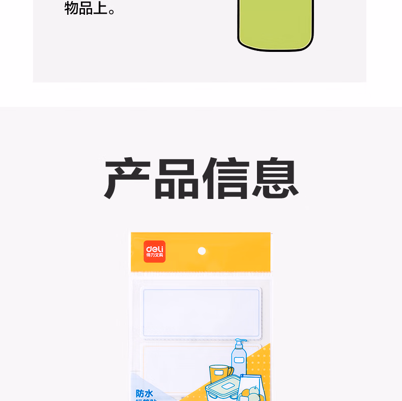 包装清单  :   得力(deli)9枚可移除标贴防水带膜34*79mm3张/包BT512