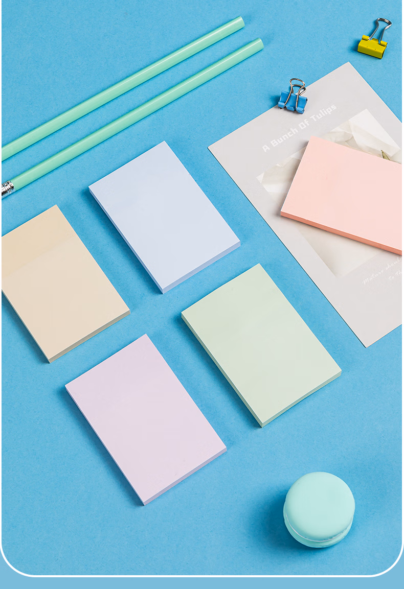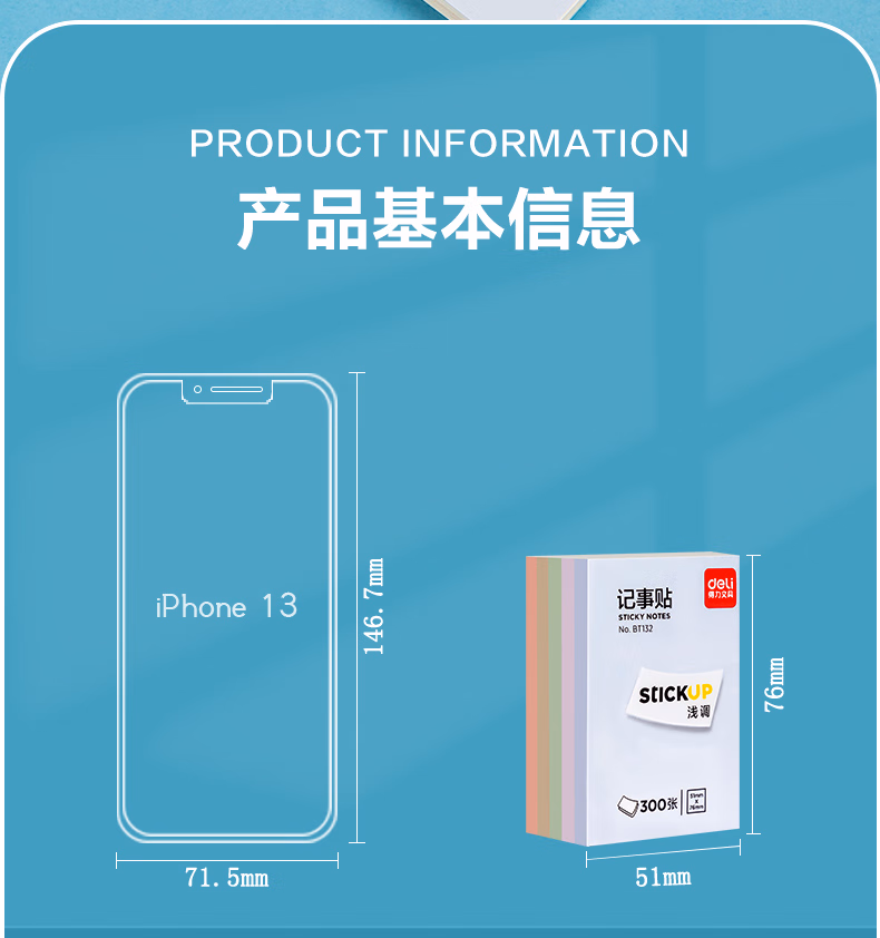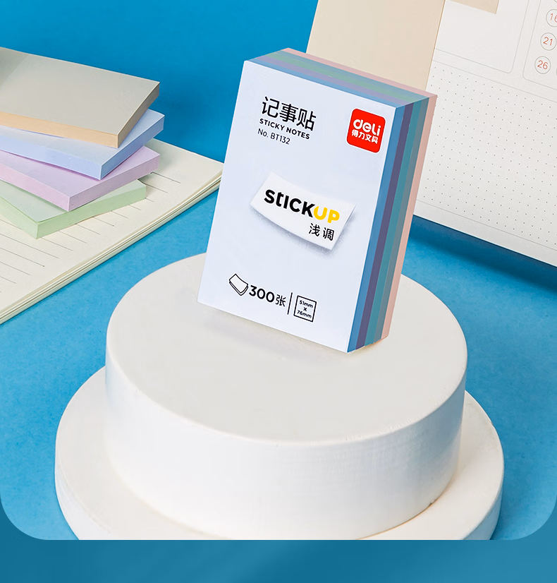 包装清单  :   得力(deli)300张5色浅调系列淡彩简约便利贴 76*51mm便签本/记事贴/ 自粘留言本 办公用品 BT132
