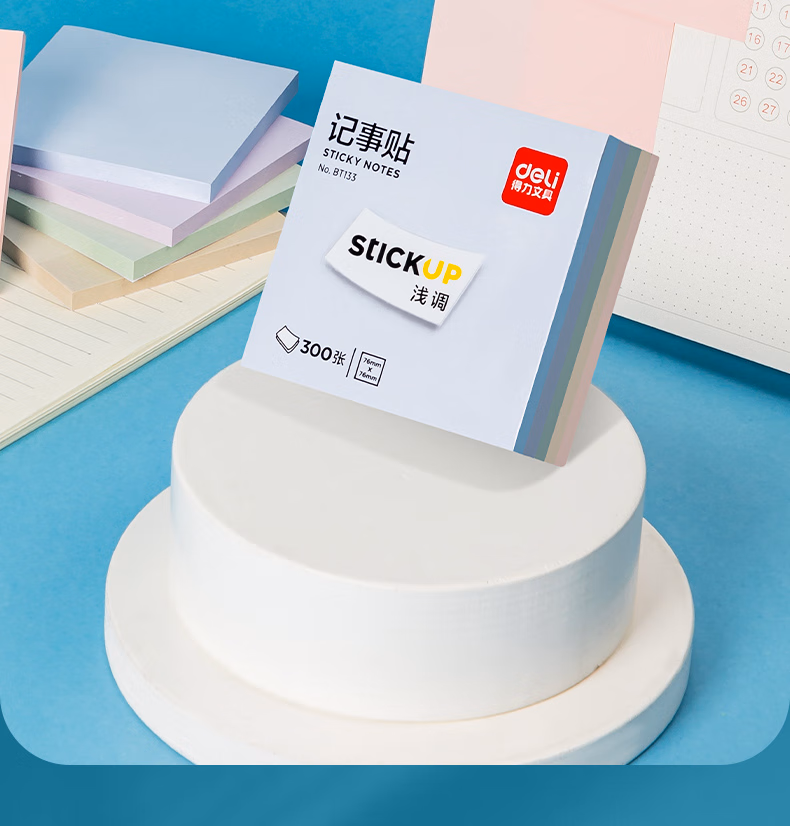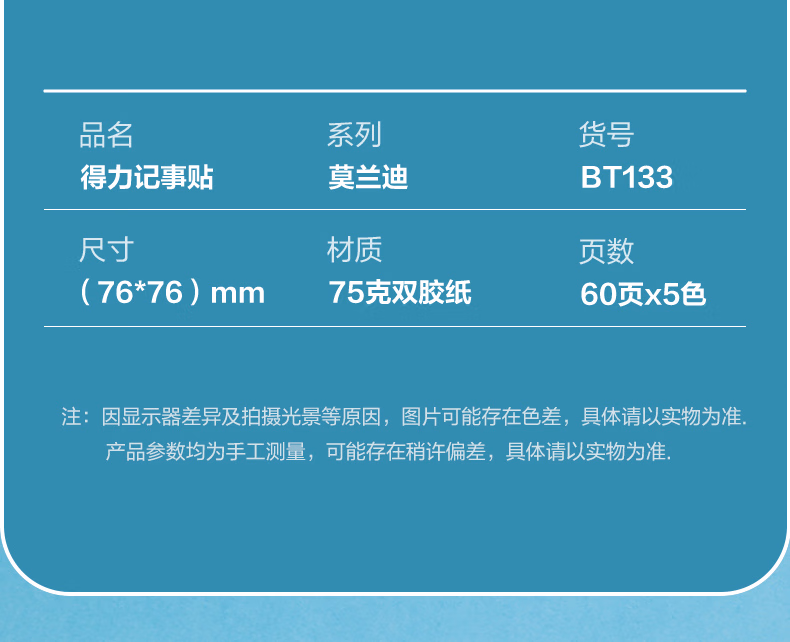 包装清单  :   得力(deli)300张5色浅调系列淡彩简约便利贴 76*76mm便签本/记事贴/ 自粘留言本办公用品 BT133