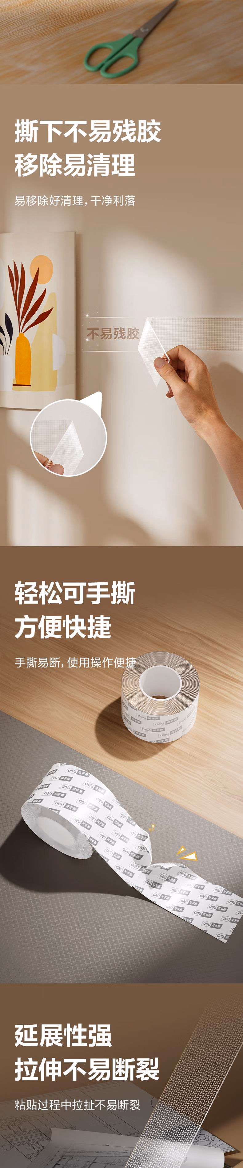 包装清单  :   得力(deli)亚克力纳米无痕网格双面胶 强力高粘防水不留痕车用透明水洗可重复使用 50mm*5m 1卷 JL545