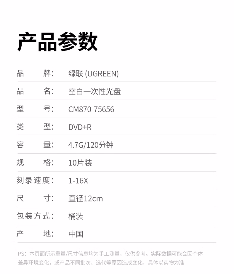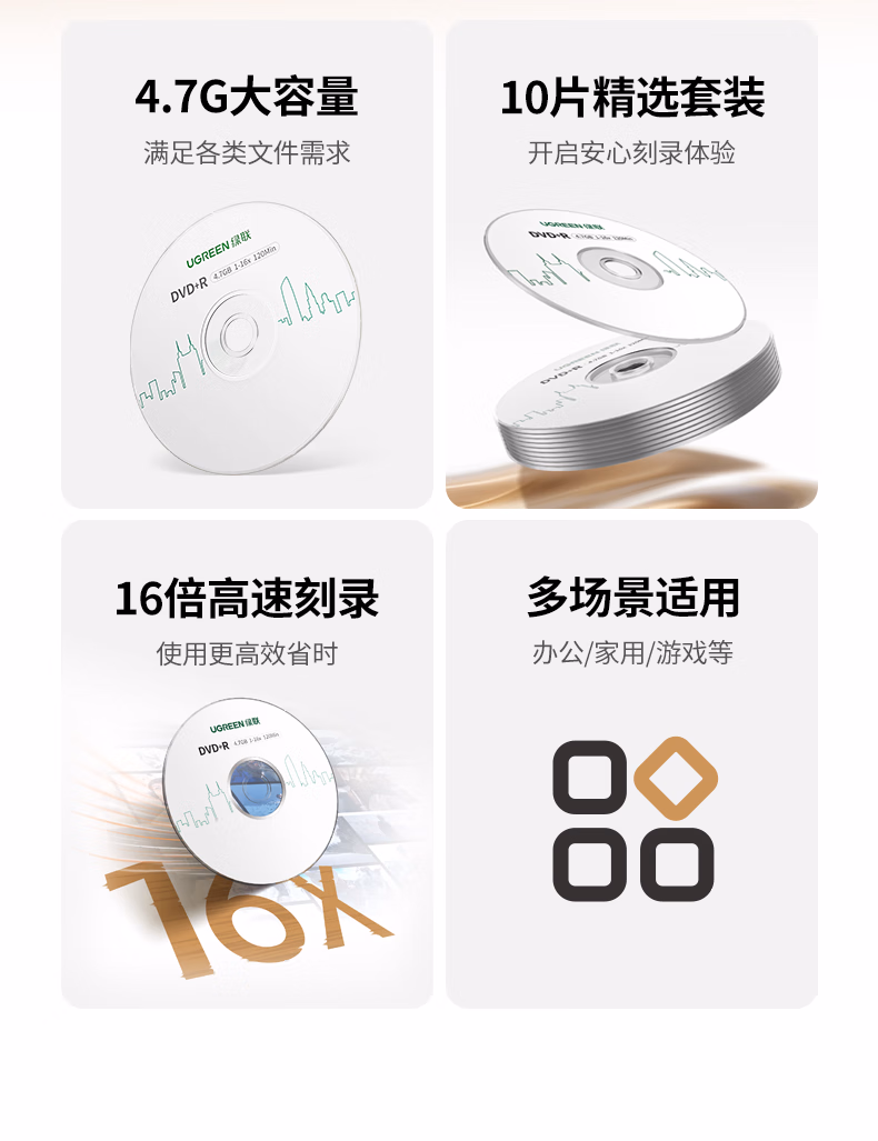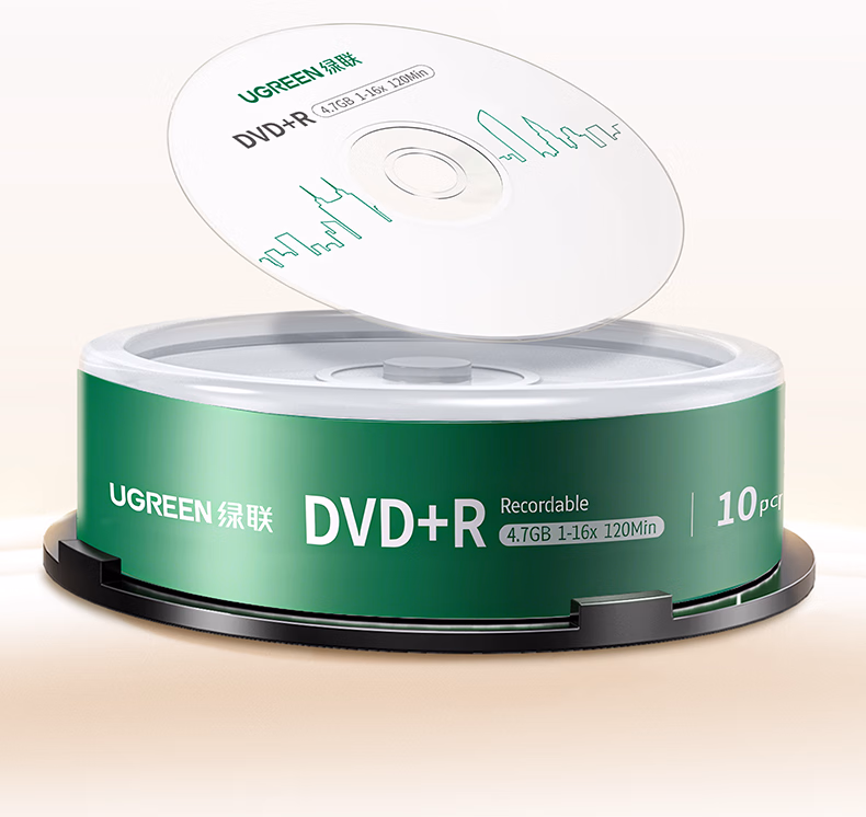 包装清单  :   绿联DVD+R空白光盘10片装 16倍速4.7G大容量 高速碟片 电脑读取刻录存储办公文件数据视频音乐75655