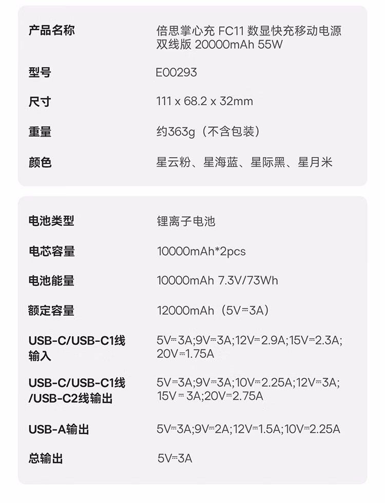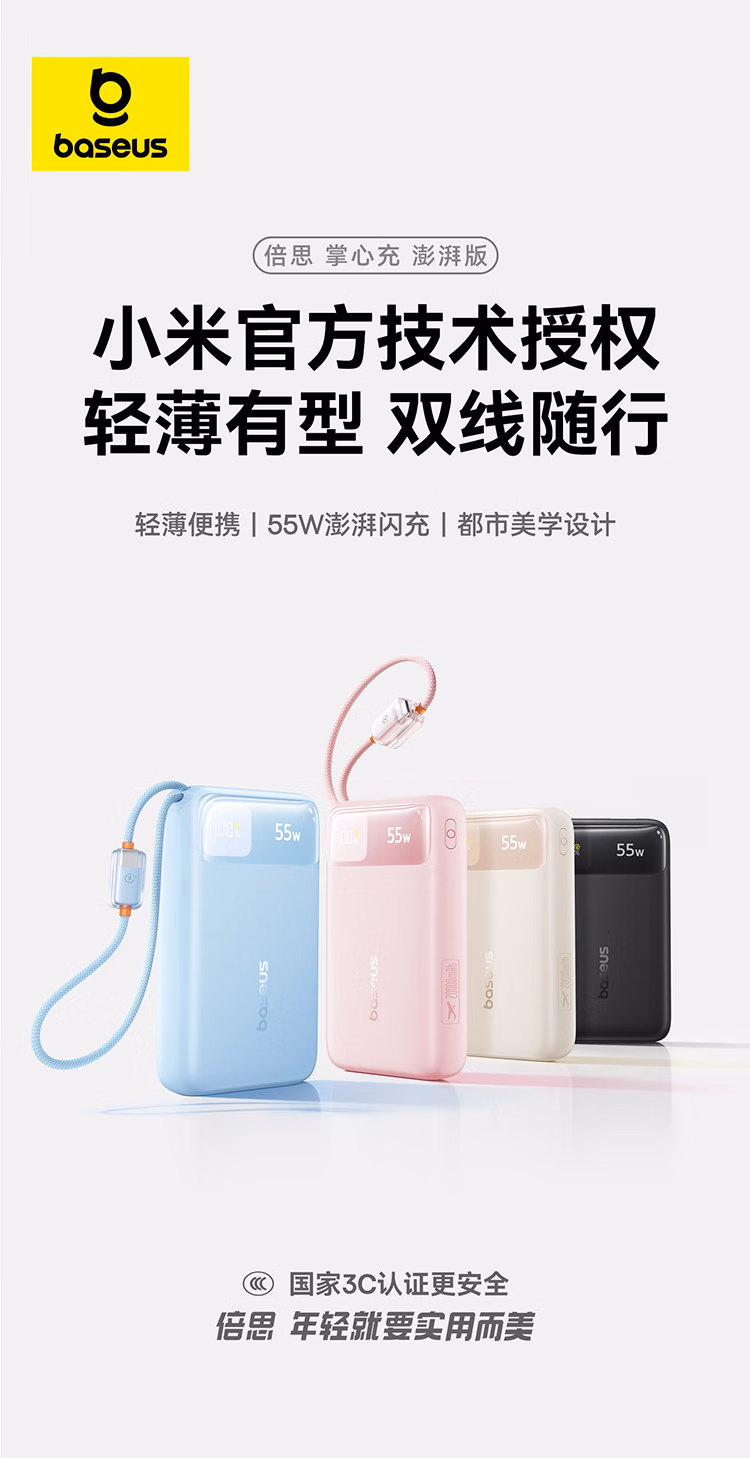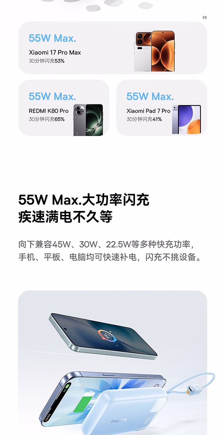 包装清单  :   倍思【3C认证可上飞机】自带线20000毫安移动电源55W快充充电宝小巧便携适用苹果17小米华为手机笔记本