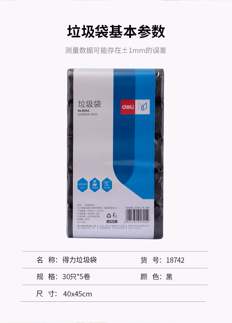 包装清单  :   得力(deli)5卷(150只)平底点断式办公生活大容量垃圾袋40*45cm 黑色18742