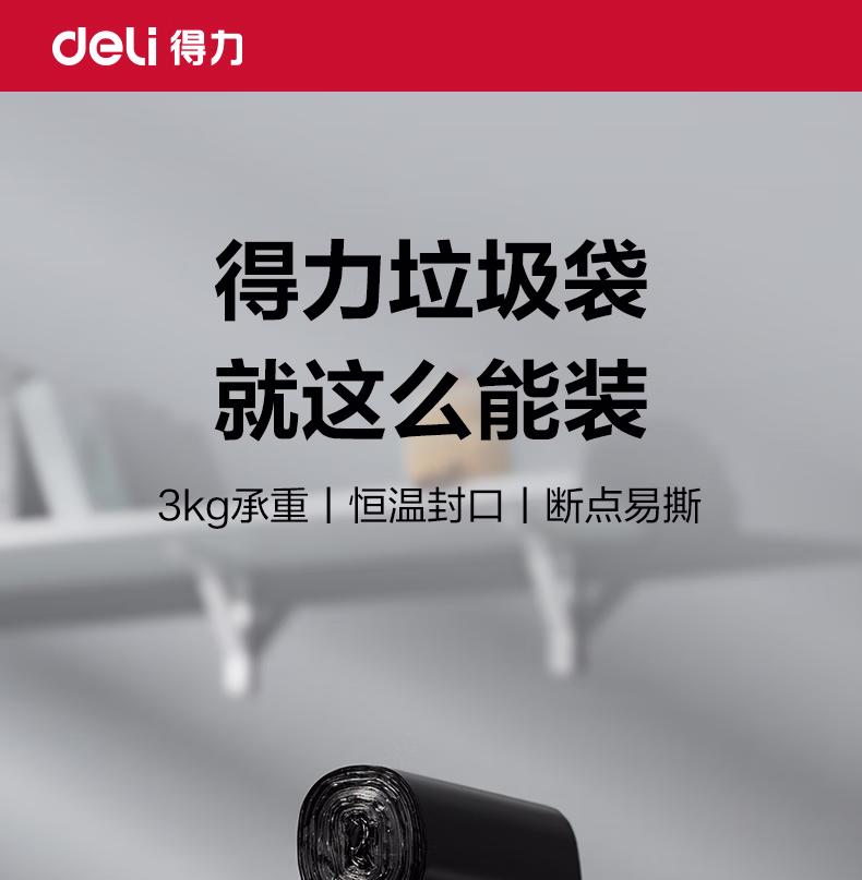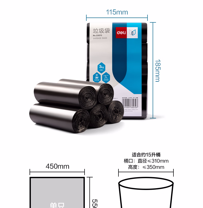包装清单  :   得力(deli)5卷(150只)办公生活垃圾袋45*55cm 垃圾分类 办公用品 黑色33070