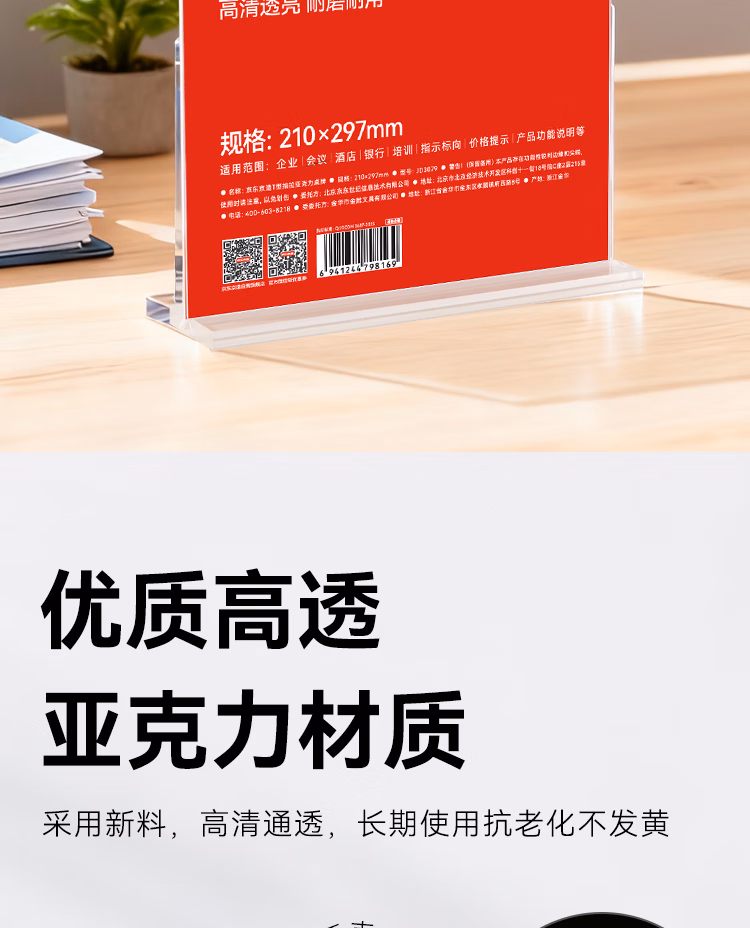 包装清单  :   京东京造T型210*297mm亚克力桌牌台卡A4立牌双面展示牌广告牌价格信息牌 会议指示牌办公用品单个装