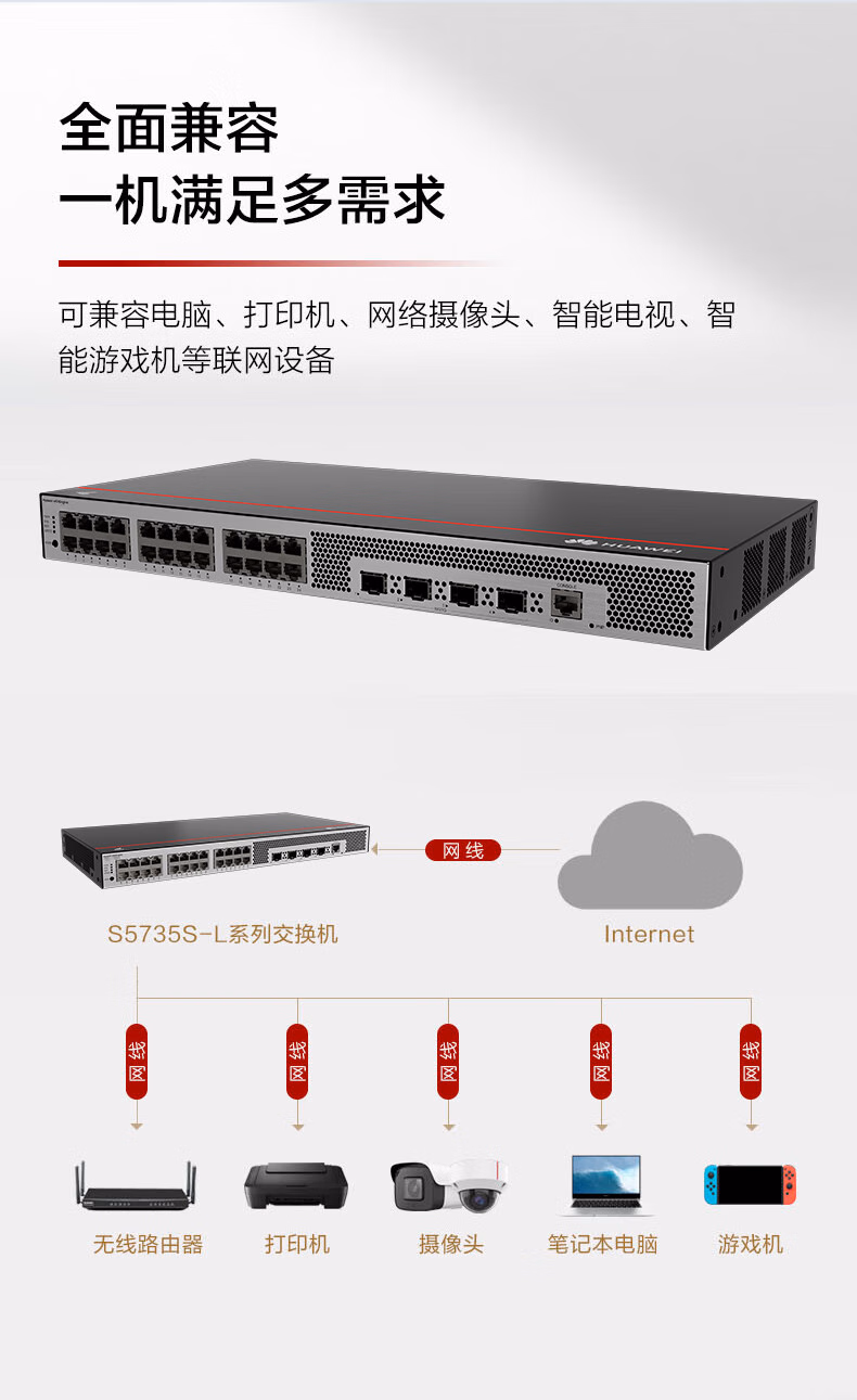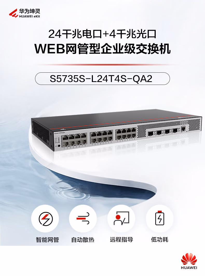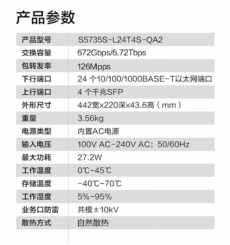 包装清单  :   华为坤灵S5735S-L24T4S-QA2千兆交换机24口千兆电口+4千兆光口 弱三层全网管企业级以太网络交换器