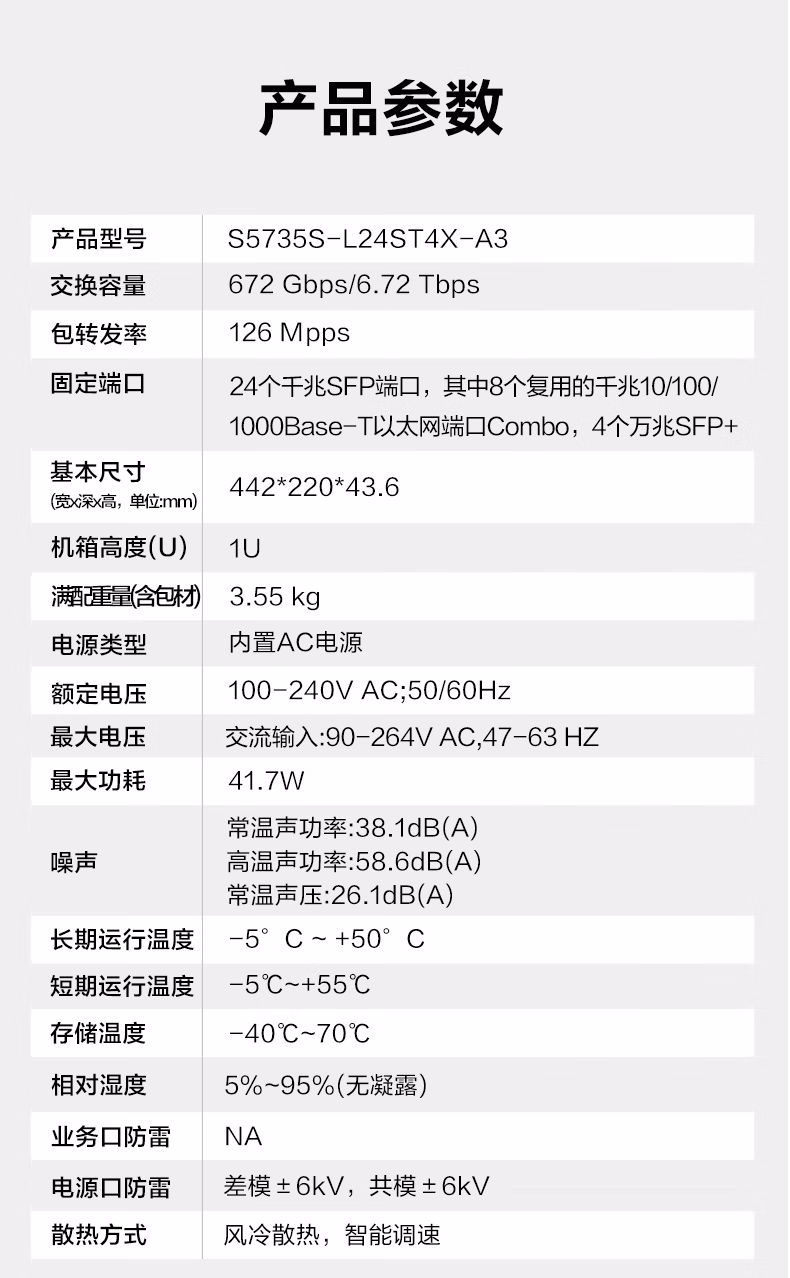 包装清单  :   华为坤灵S5735S-L24ST4X-A3万兆交换机24口千兆光+4口万兆光+8口千兆光电混合Combo口三层网管以太网络