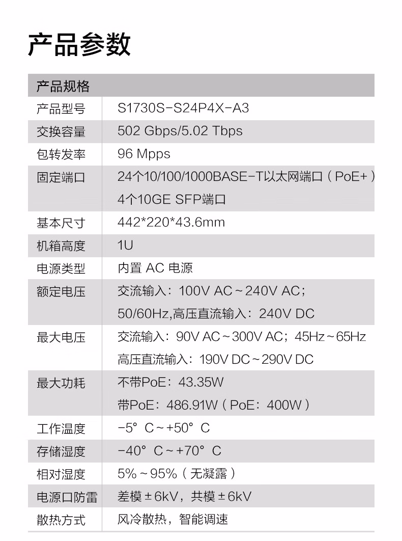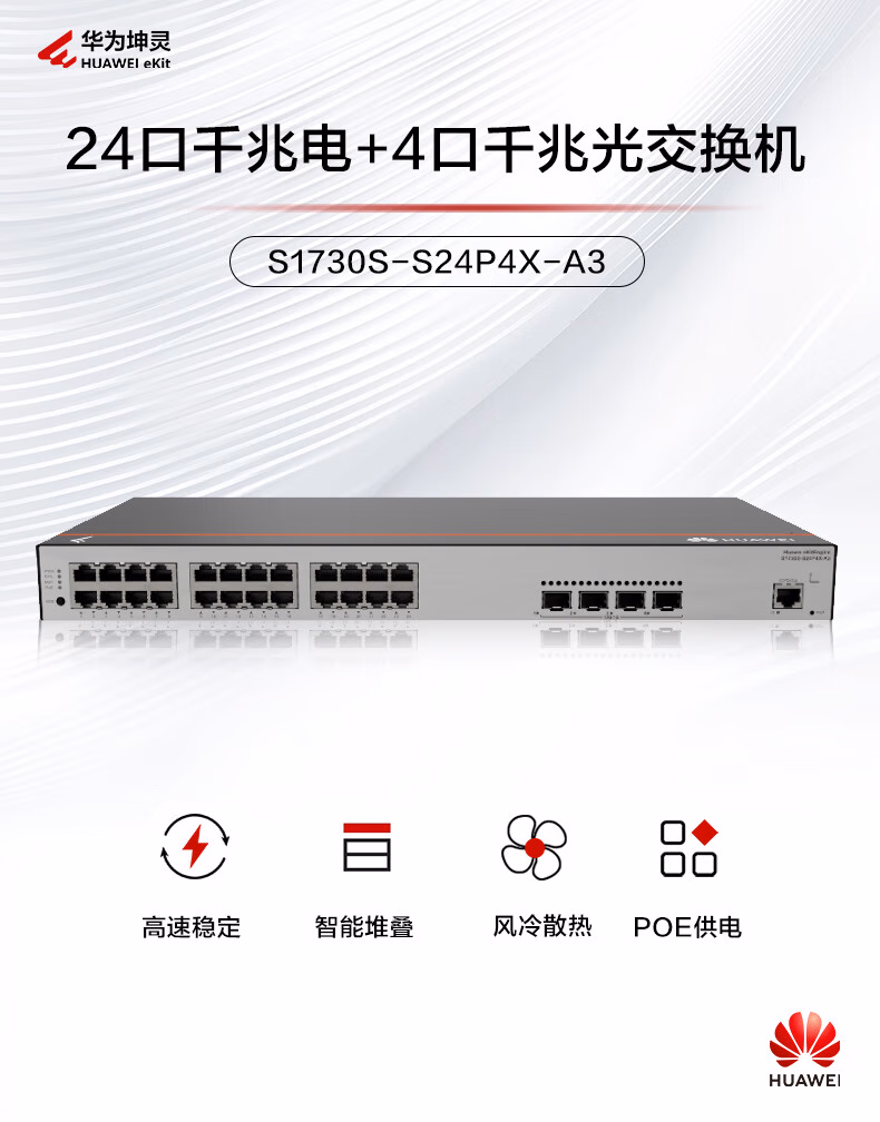 包装清单  :   华为坤灵 S1730S-S24P4X-A3 24口千兆POE供电交换机 二层Web管理企业园区网络家用交换器 4口万兆光 功率400W