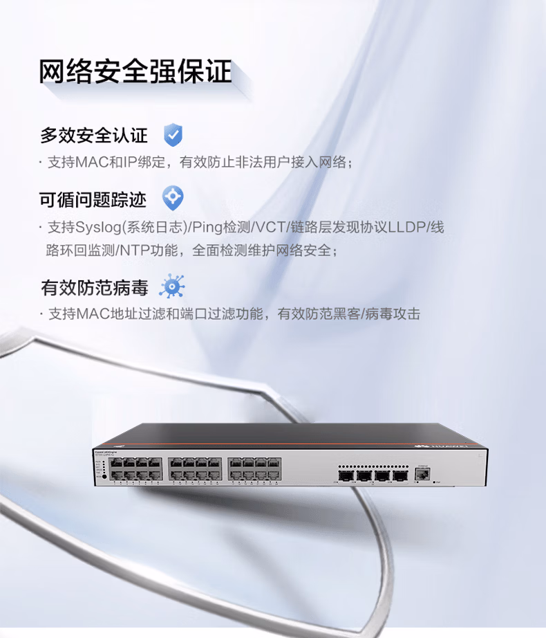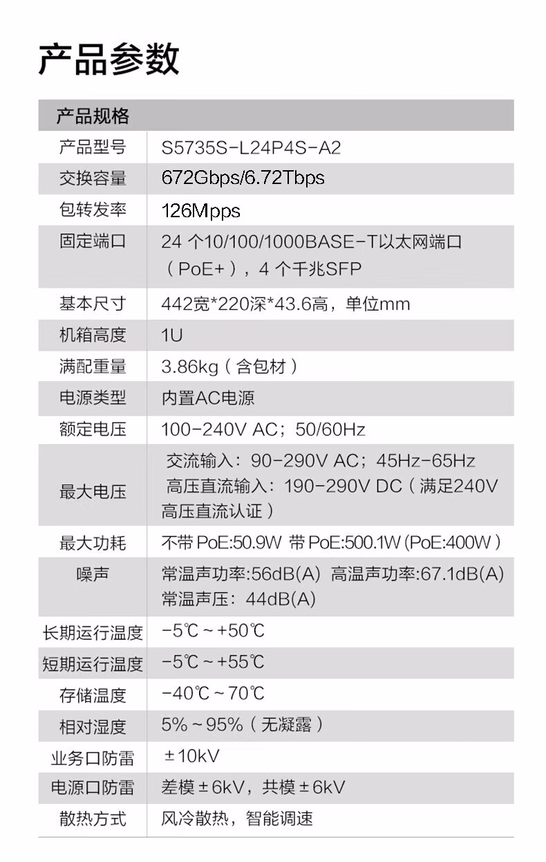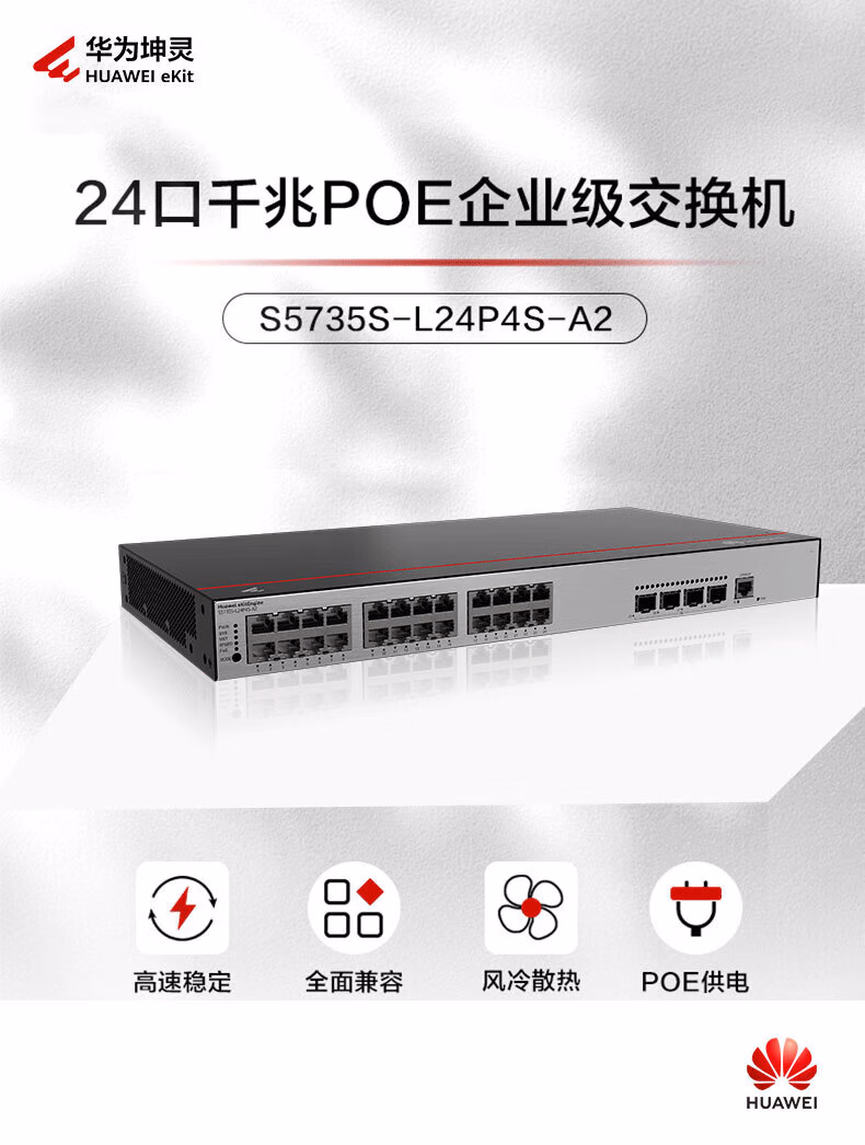 包装清单  :   华为坤灵 S5735S-L24P4S-A2 企业级24口千兆三层汇聚网管POE交换机 4个千兆光口 支持VLAN 堆叠 环网 功率400W