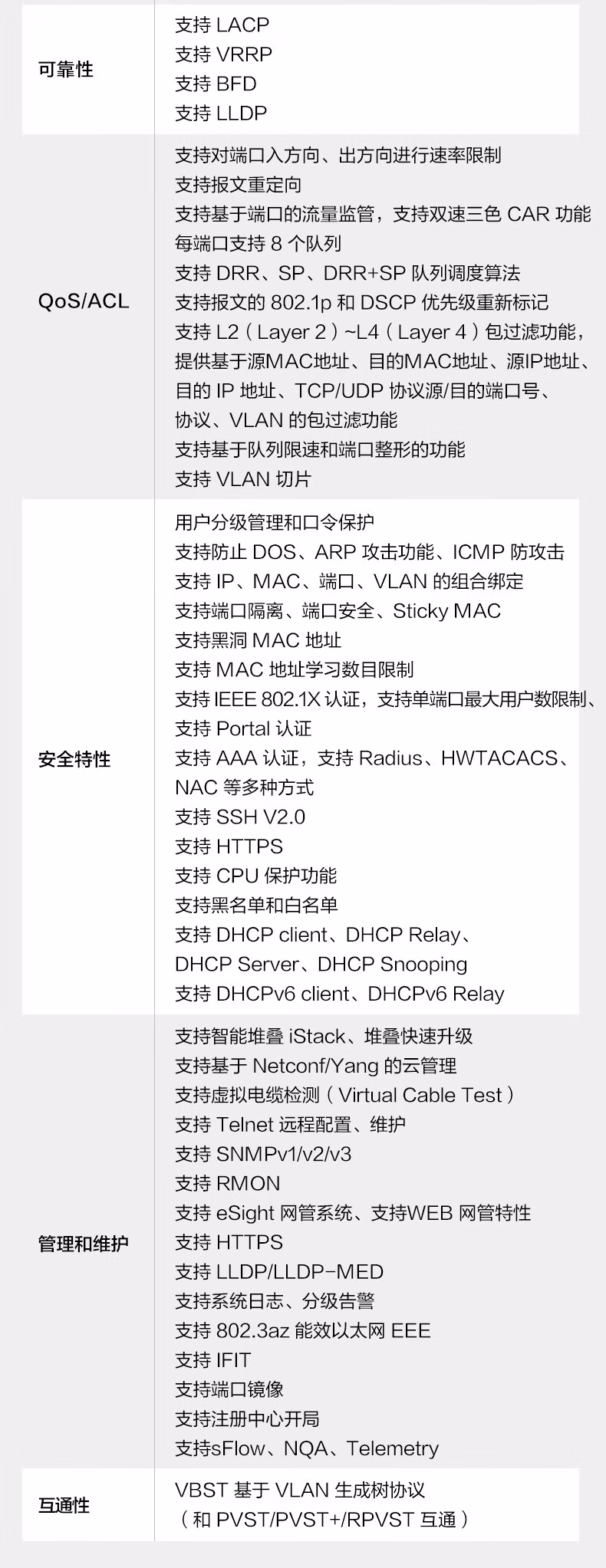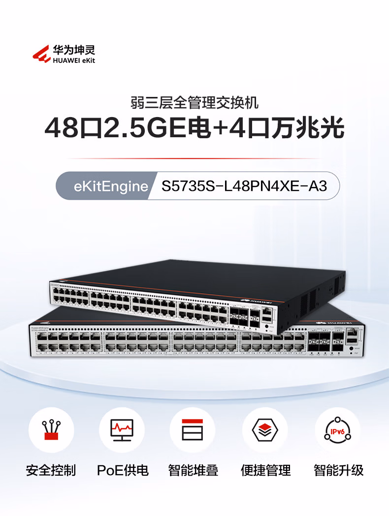 包装清单  :   华为坤灵 企业园区48个2.5G电口POE交换机 4个万兆光口 万兆堆叠口 S5735S-L48PN4XE-A3 组播 环网 功率360W
