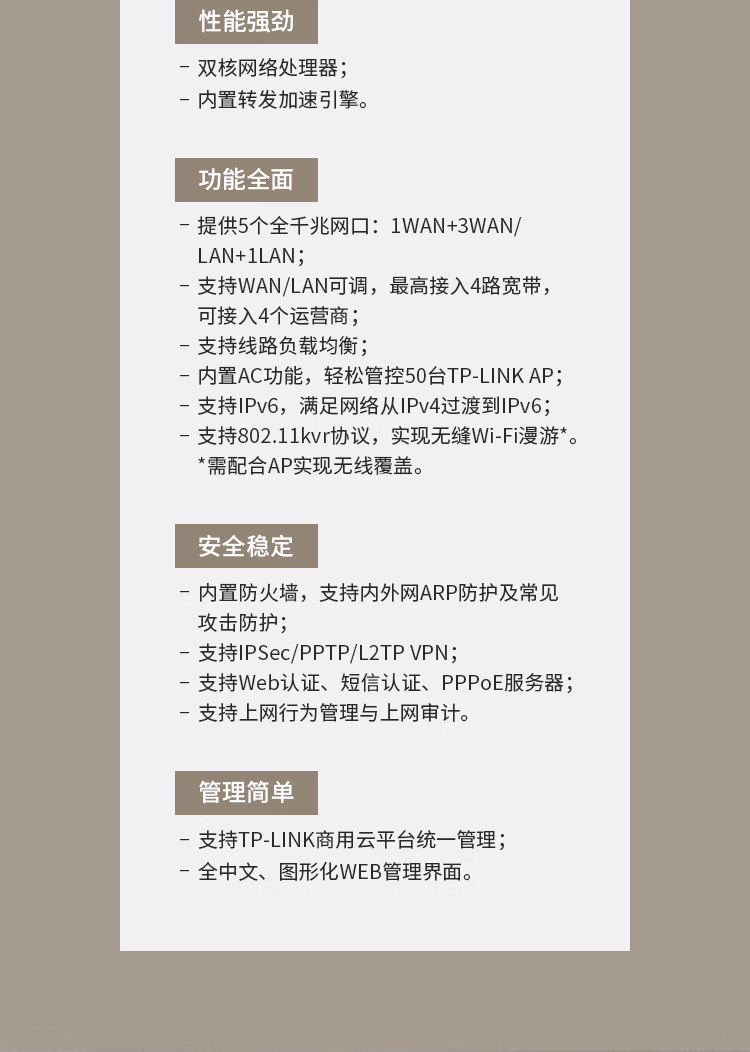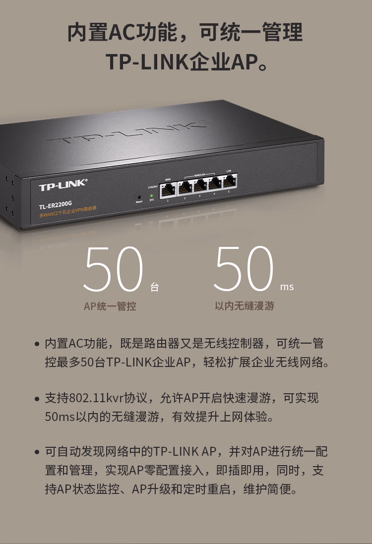 包装清单  :   普联(TP-LINK)多WAN口千兆企业VPN路由器 TL-ER2200G 1个