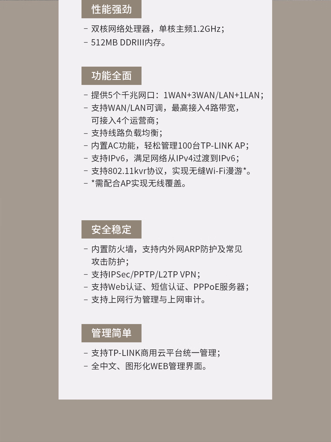 包装清单  :   普联(TP-LINK)双核多WAN口千兆企业VPN路由器 防火墙/VPN/AP管理 TL-ER3200G