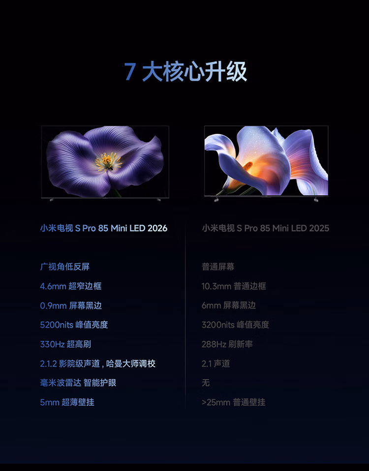 包装清单  :   小米电视S Pro Mini LED 85英寸 2026款 5200nits 2880分区 330Hz 广视角低反屏
